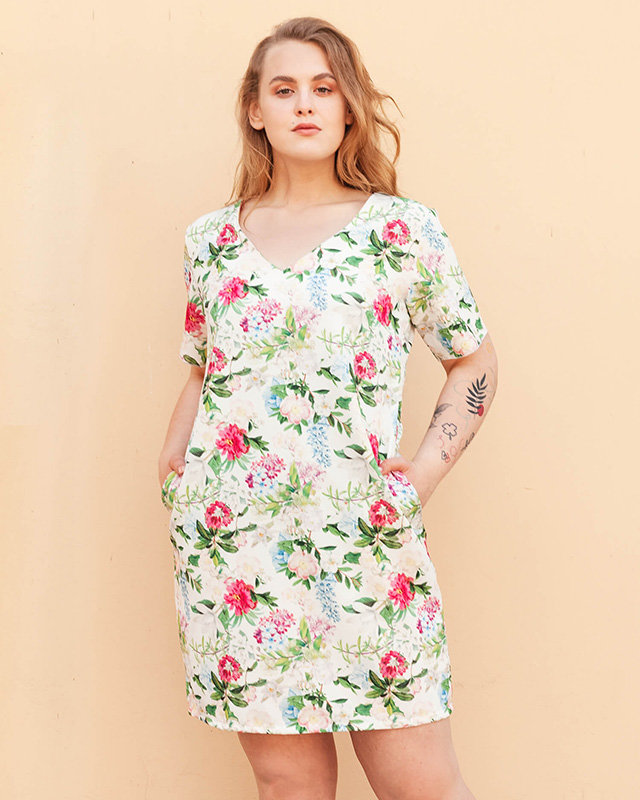 Жіноча біла квіткова сукня з кишенями PLUS SIZE - Одяг