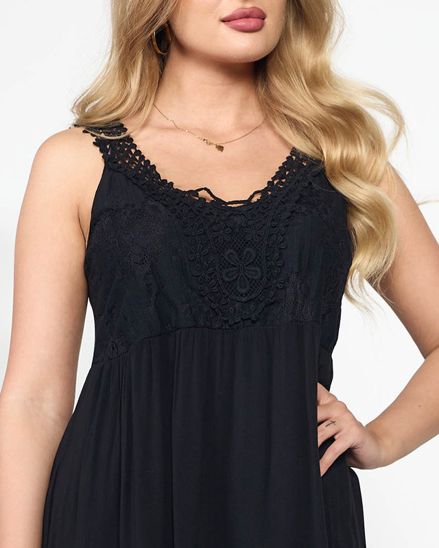 - Мила жіноча сукня міді, виготовлена з легкої бавовняно-віскозної тканини. Модель на ажурних бретелях та з ажурним вирізом. Низ сукні прикрашений оборкою. Точність вимірювання (+/-) 1 см.
