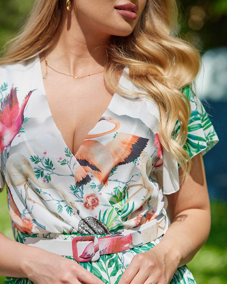 - Вічна жіноча плісирована сукня, виготовлена з легкої тканини з екзотичним малюнком. Модель довжиною до коліна з вирізом-конверт, короткими рукавами та еластичним поясом. Крім того, в комплекті ремінь. ПРИМІТКА: Точність вимірювання (+/-) 1 см.