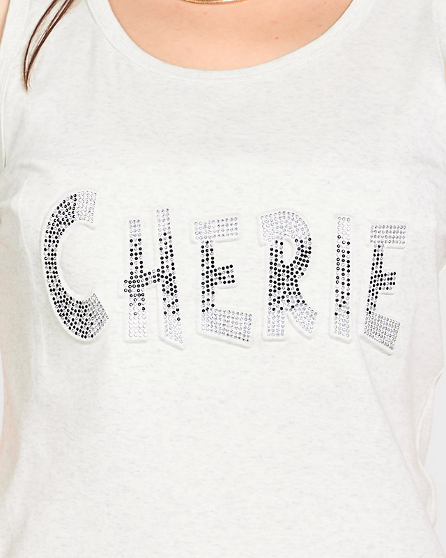 - Стильний жіночий базовий топ на широких бретелях. Виготовлений з бавовняної тканини. Модель прикрашена написом зі стразами. Ідеальна основа для багатьох повсякденних образів!