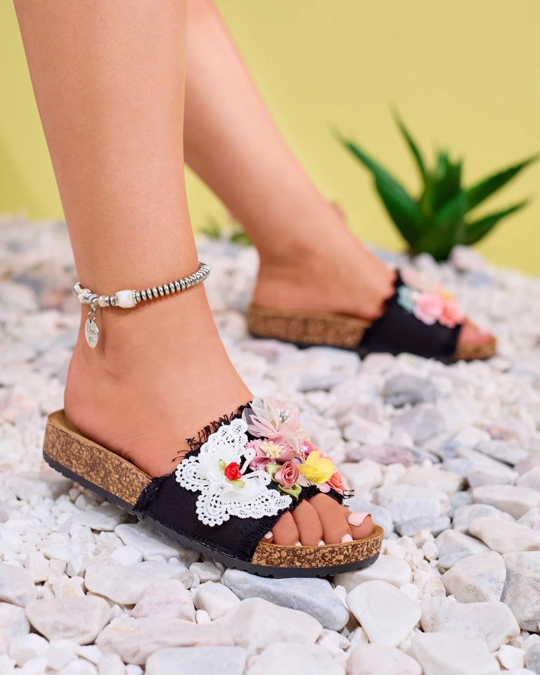 - Чарівні жіночі шльопанці. Виконані з екологічної замшевої шкіри та декоровані тканинними квітами з перлами. Яскраве доповнення до багатьох літніх образів!