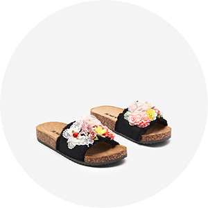 - Чарівні жіночі шльопанці. Виконані з екологічної замшевої шкіри та декоровані тканинними квітами з перлами. Яскраве доповнення до багатьох літніх образів!