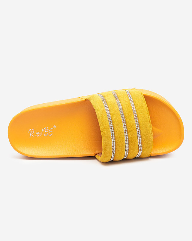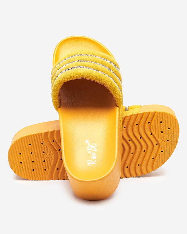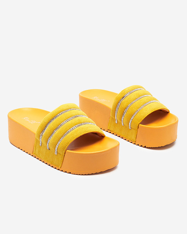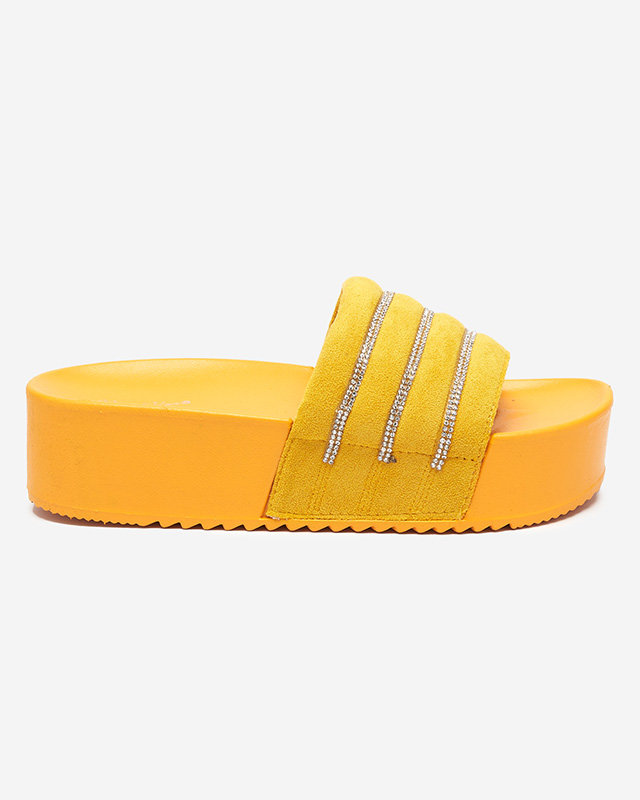 - Стильні жіночі шльопанці на платформі. Ремінець виготовлений з екологічної замшевої шкіри та прикрашений стразами, устліка з гумового матеріалу.