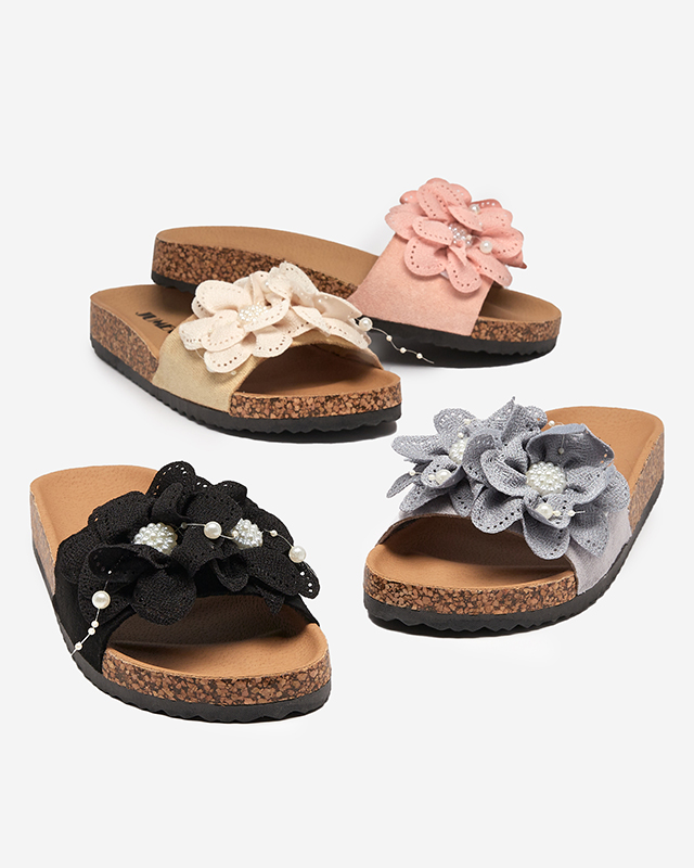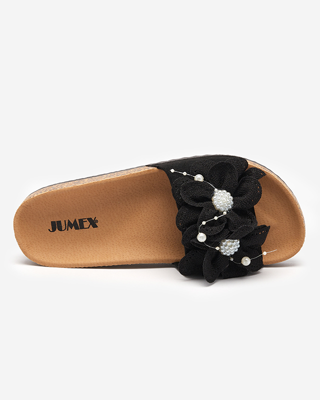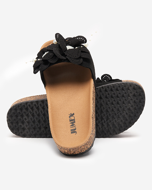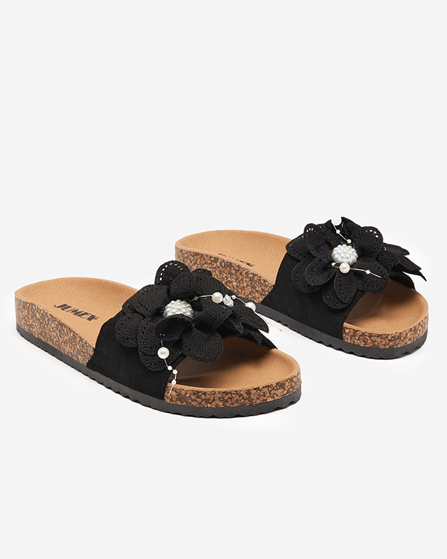 OUTLET Чорні жіночі тапочки з тканинними квітами Serine - Взуття