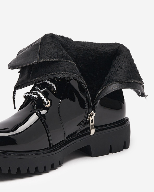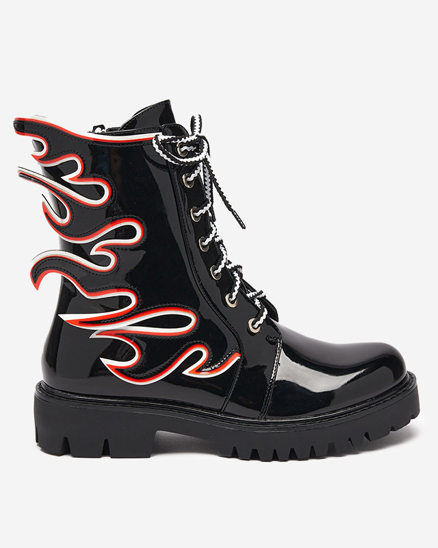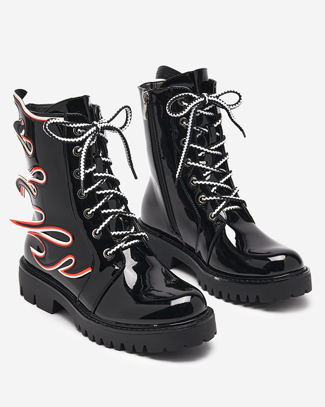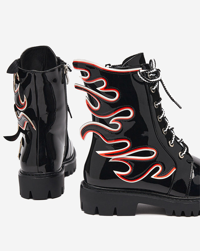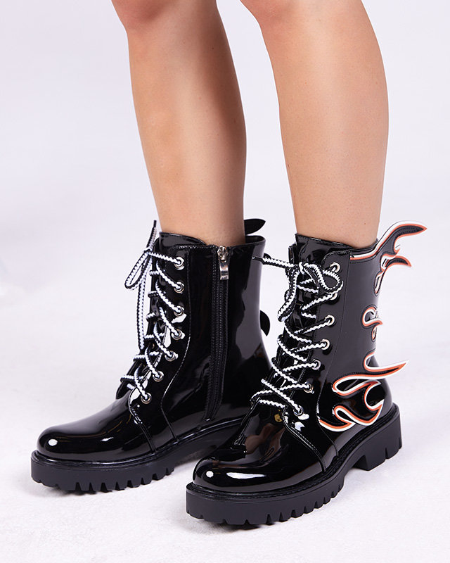 • Чорні жіночі чоботи з лакованої екологічної шкіри, верх прикрашений візерунком вогню. Воркери на шнурівці та застібаються на блискавку, внутрішня частина взуття утеплена штучним матеріалом. ЖІНОЧІ ЧОРНІ ТЕПЛІ ЧОБОТИ ЛАКОВАНІ ВОРКЕРИ FIRE