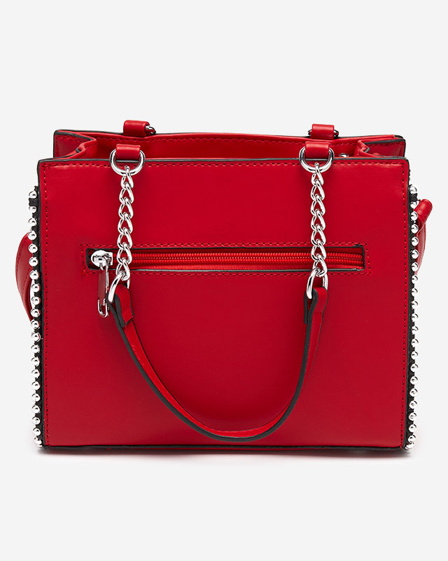 • Жіноча сумочка з екошкіри, передня частина з плетеною вставкою - з боків прикрашена сріблястими заклепками, застібається на блискавку. Модель має: - 1 відділення, - 2 кишені всередині, - 1 зовнішню кишеню, - знімний ремінь з можливістю регулювання.