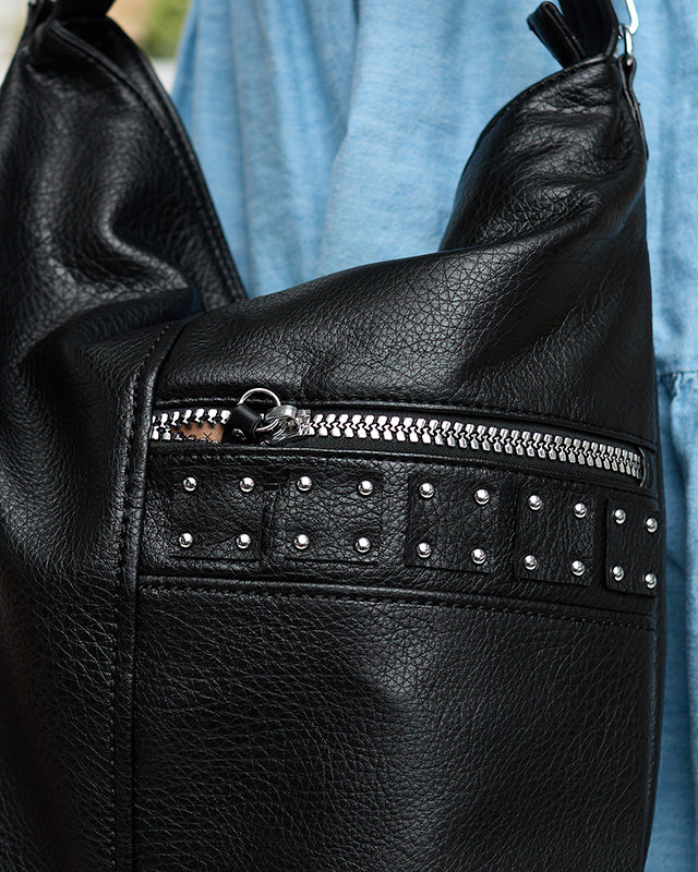 - Модна жіноча сумка-шоппер, яка застібається на блискавку, виготовлена з екошкіри з декоративними стразами. Модель має: - 1 відділення, - 2 накладні кишені та 4 кишені на блискавці, - ручку та знімний пояс, який можна регулювати.