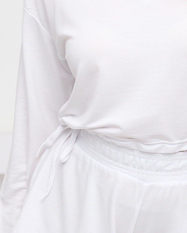 - Зручний жіночий спортивний комплект з бавовняної тканини. Укорочений топ має довгі рукави, оброблені прорізами, і регульованими шнурками на талії. Шорти оснащені еластичним поясом. ПРИМІТКА: Точність вимірювання (+/-) 1 см.
