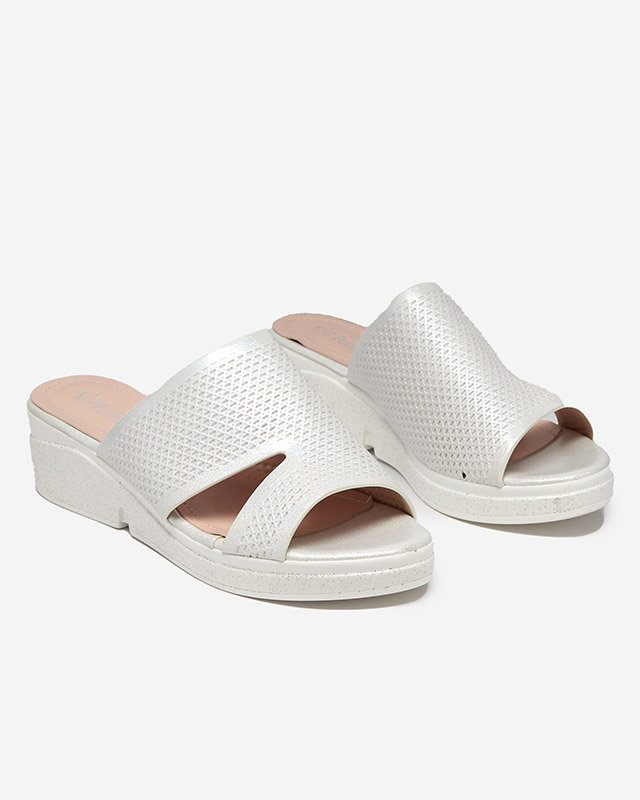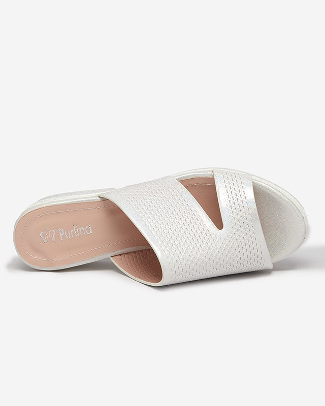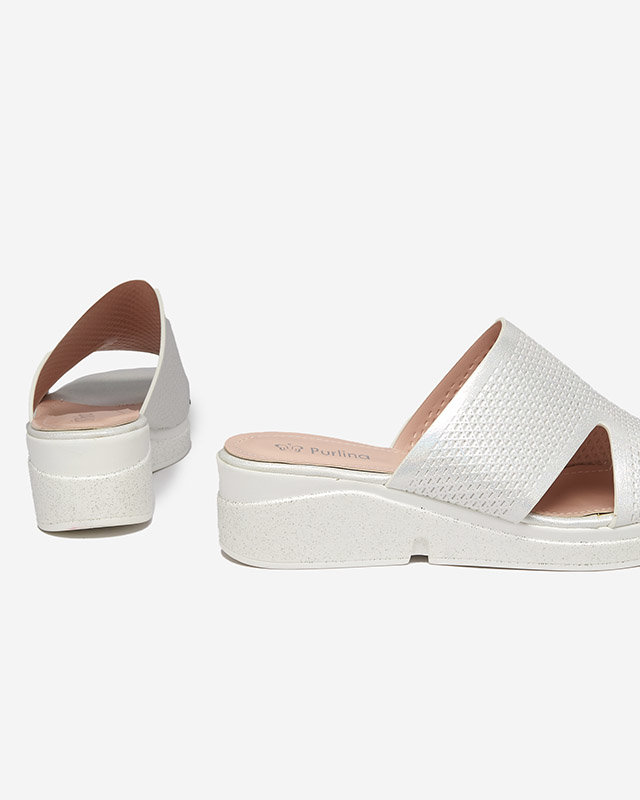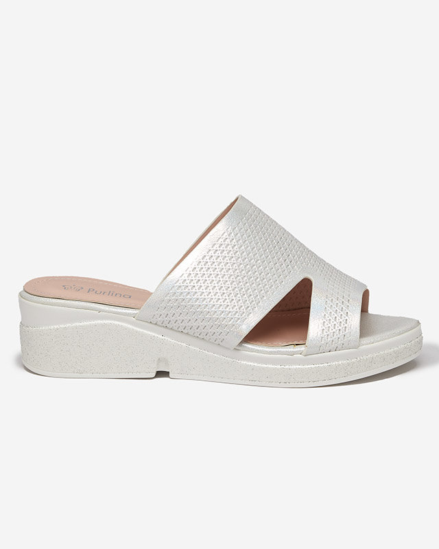 - Модні жіночі тапочки на невисокій танкетці, виготовлені з м'якої екологічної шкіри. Модель оброблена блискітками. Одягніть їх на літо з короткою сукнею!