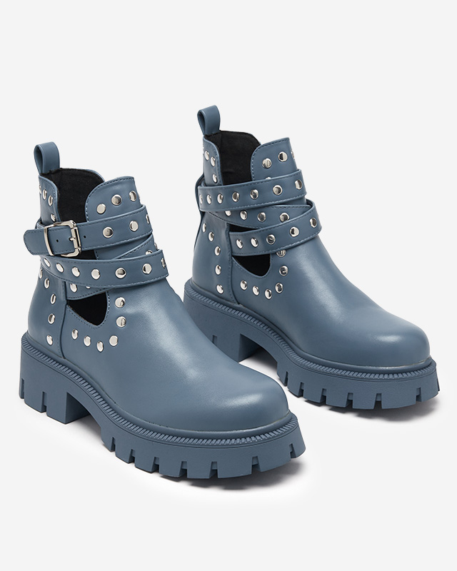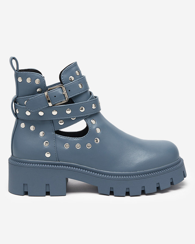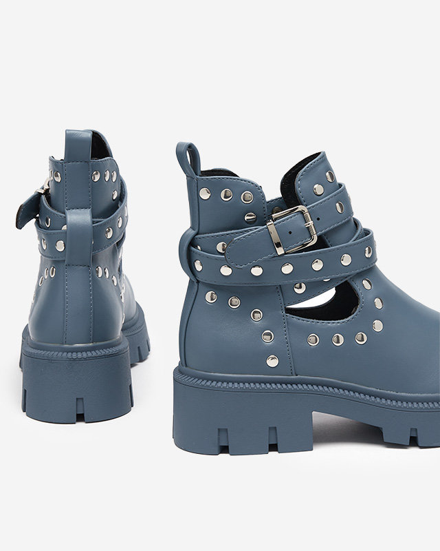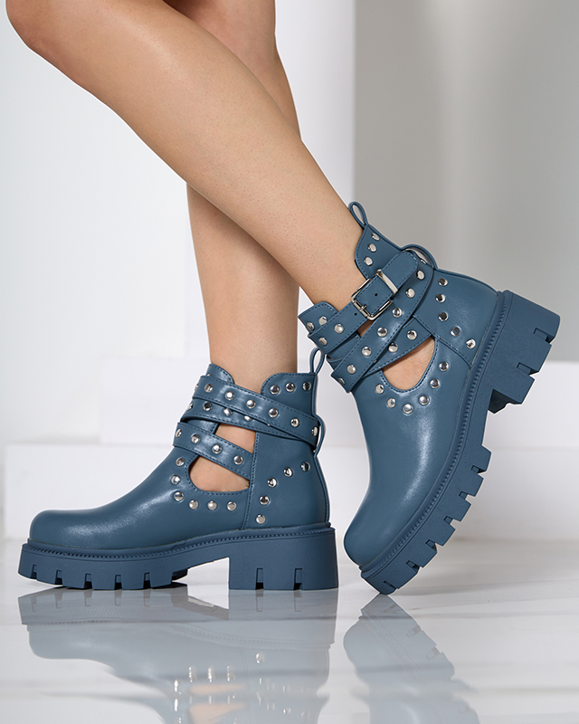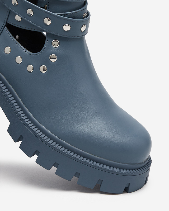 - Чоботи на плоскій підошві з еко шкіри, тканинна вставка. Модель сліпони, верх прикрашений вирізами та стразами. БЛАКИТНІ ЖІНОЧІ ЧЕРЕВИКИ З ЕКО ШКІРИ SOCOGI