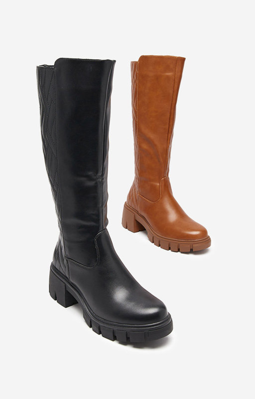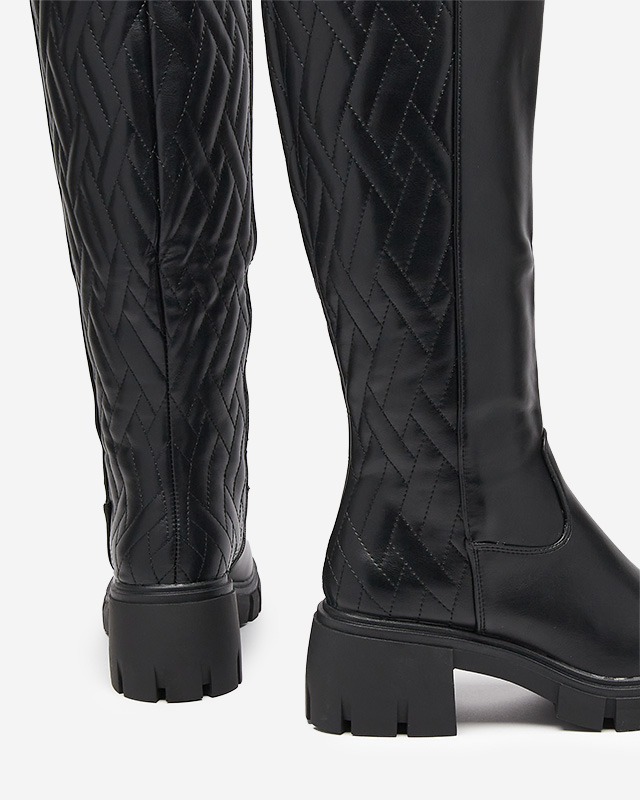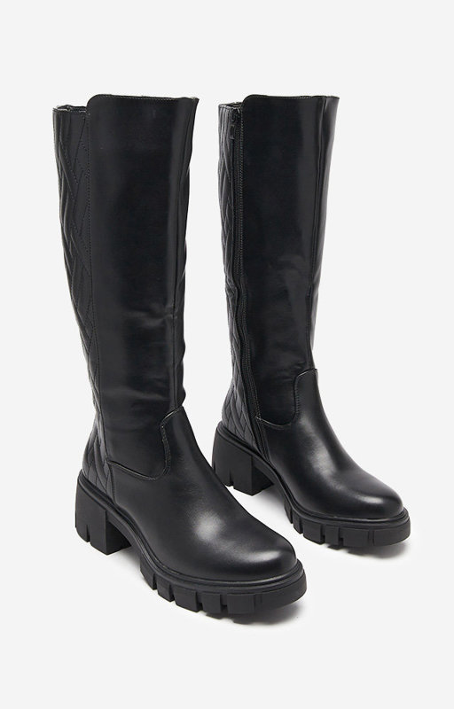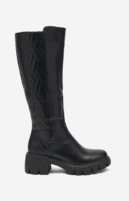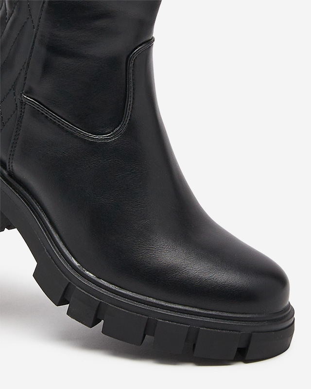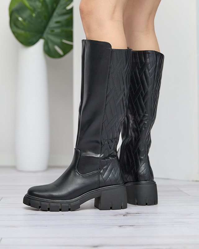 • Чоботи жіночі з еко-шкіри. Задня частина халяви прикрашена тисненням, підошва гумова, всередині обшите тканиною, збоку застібка-блискавка. ЧОРНІ ЖІНОЧІ ЧОБОТИ RADISHA