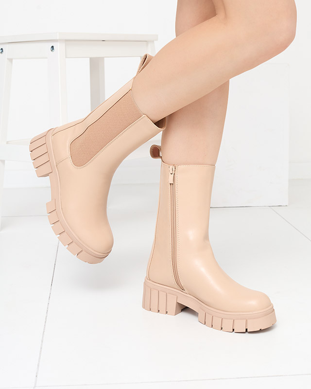- Чоботи жіночі високі на товстій підошві, виготовлені з екологічної шкіри. Середина взуття утеплена м'яким хутром, верх має гнучку вставку. З боків модель застібається на блискавку. БЕЖЕВЕ ВЗУТТЯ УТЕПЛЕНІ ЗИМОВІ ЧОБІТКИ OTIKA