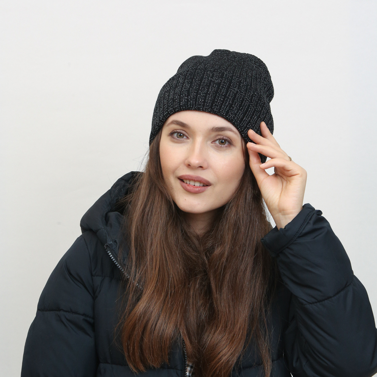 - Класична двошарова жіноча шапка біні. Модель без утеплювача, декорована по всій довжині сріблястою ниткою. Абсолютний must have на осінь!