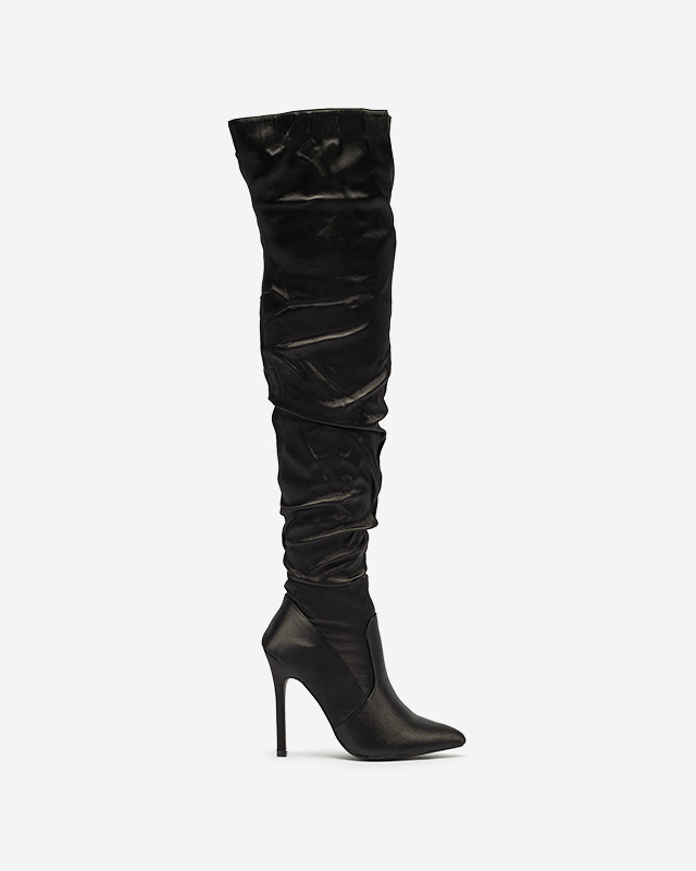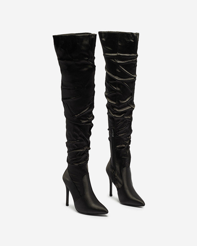- Елегантні чоботи на шпильці, все з атласу. Модель з гострим носком, застібається на блискавку до середини ікри. Устілка виконана з тканини. ВЗУТТІ ЖІНОЧІ ЧОРНІ НА КАБЛУКУ HUMICO