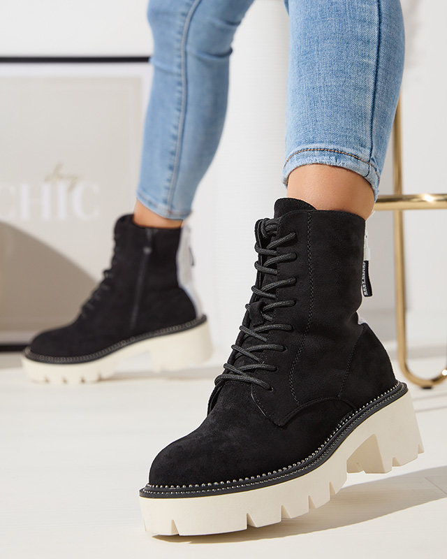 • Стильні жіночі чоботи на низькій посадці, виготовлені з екологічної замші. Модель зашнурована і застібається на блискавку, всередині утеплена ніжним хутром. Ідеальне взуття для створення оригінальних образів! ЧОРНІ ТУФЛІ ЧОБОТИНКИ SAVET