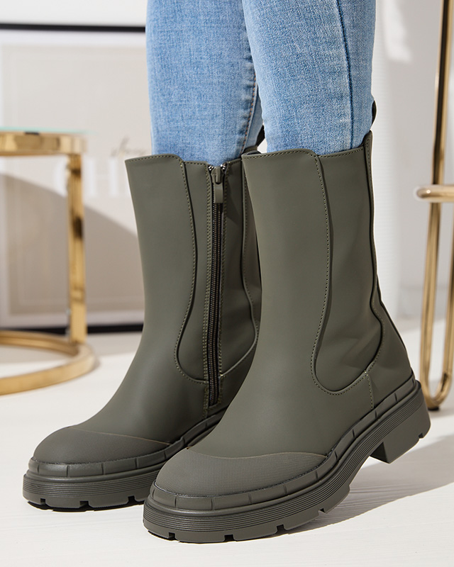 • Наймодніші в цьому сезоні жіночі високі чоботи на суцільній підошві. Верх виконаний з екологічної шкіри з матовим покриттям, середина утеплена м'яким хутром. На носку декоративна вставка з гуми. ТЕМНО-ЗЕЛЕНІ УТЕПЛЕНІ ЧОБОТИ ДЖОРІ