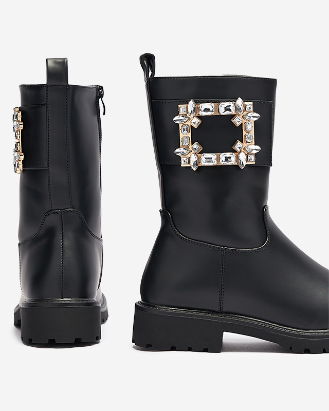 • Класичні жіночі черевики з екошкіри на плоскому каблуці. Устілка зсередини утеплена тонким поролоном. Пара застібається на блискавки з боків та має золотистий металевий орнамент зі стразами. ЧОРНІ УТЕПЛЕНІ ЧОБОТИ ЧЕРЕВИКИ XETIKA
