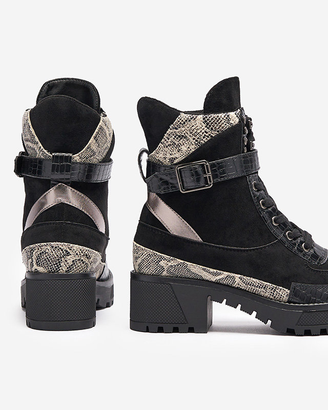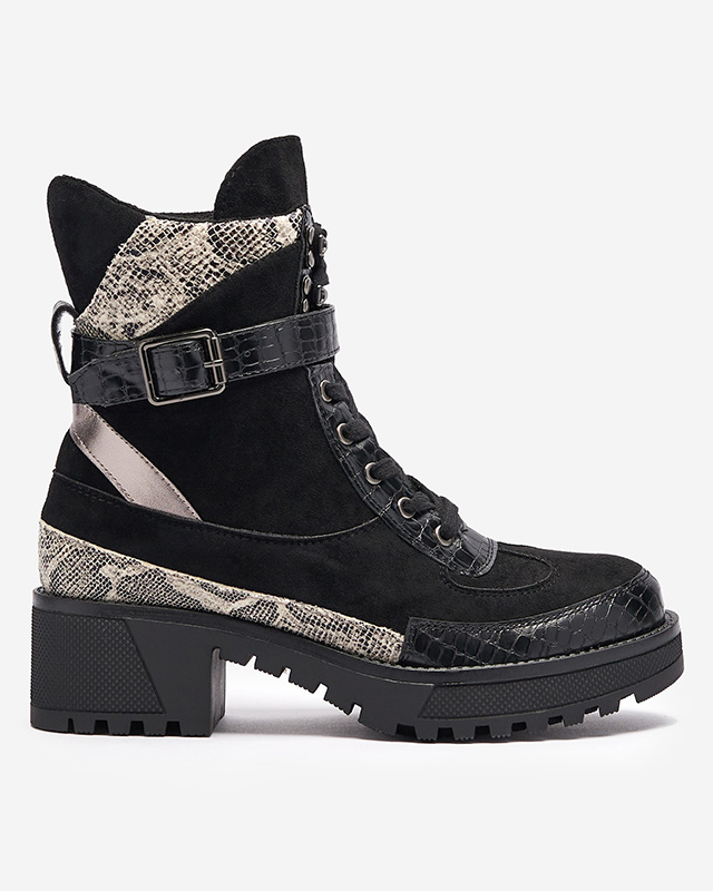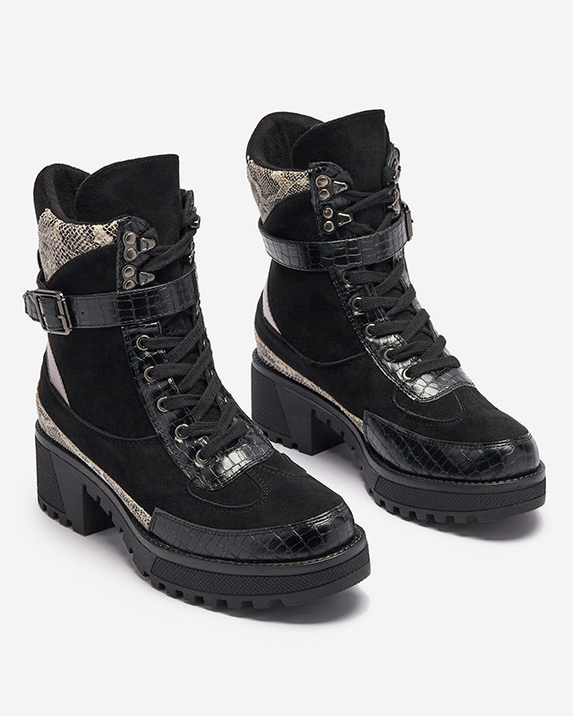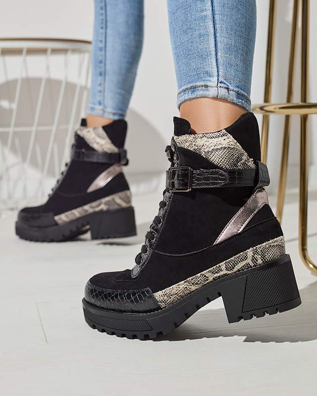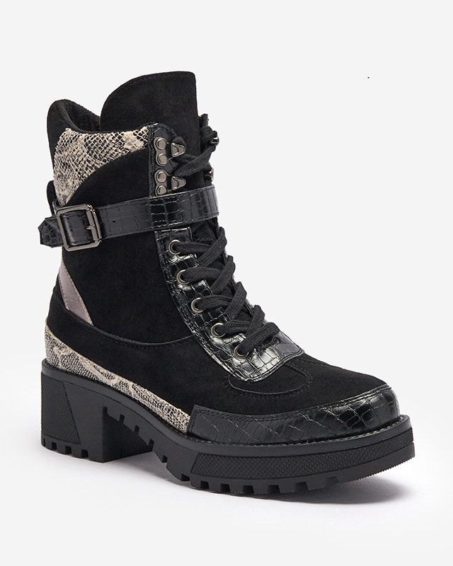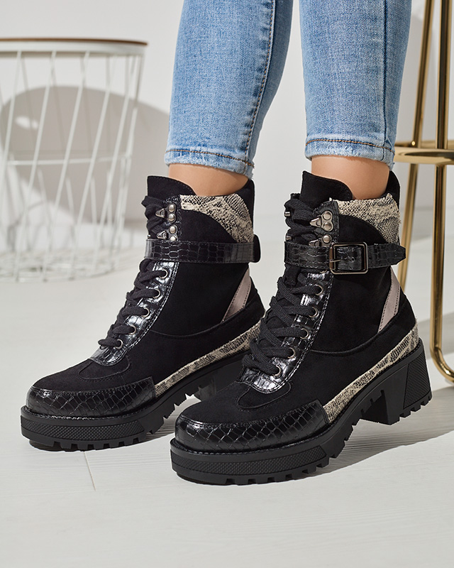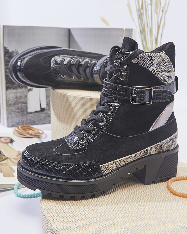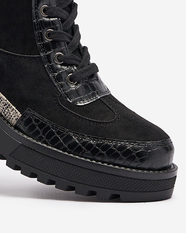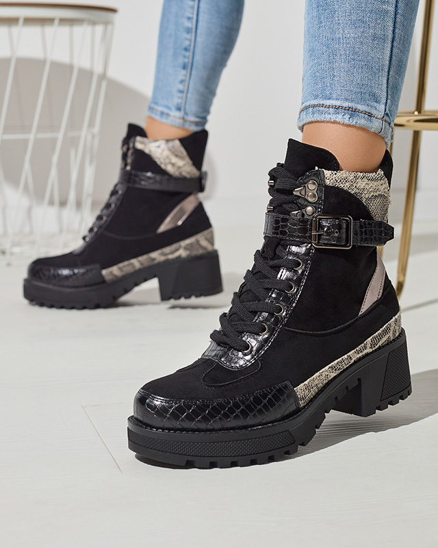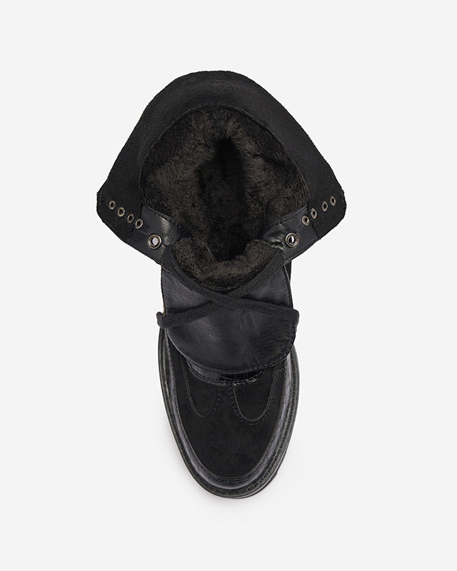 - Жіночі високі черевики на суцільній підошві. Верх виконаний з комбінації тисненої натуральної шкіри та натуральної замші. Модель на шнурівці. Внутрішня частина на хутряній підкладці. ЧОРНІ УТЕПЛЕНІ ЧОБОТИ GERICSA