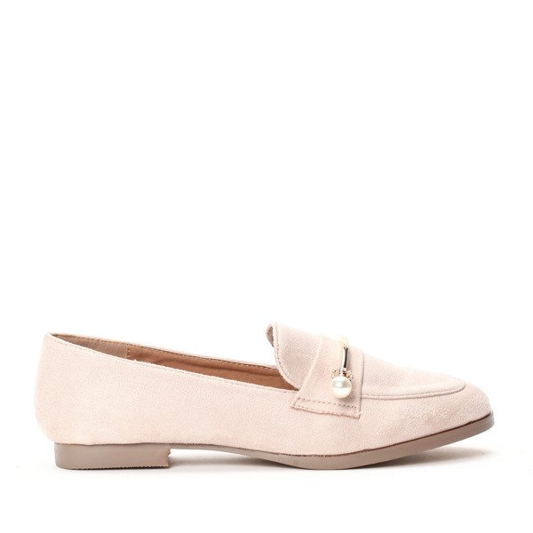 • Śliczne mokasyny wykonane z miękkiego w dotyku ekologicznego zamszu. Na cholewce złota ozdoba. Delikatny, płaski obcas. Idealne do modnych stylizacji.