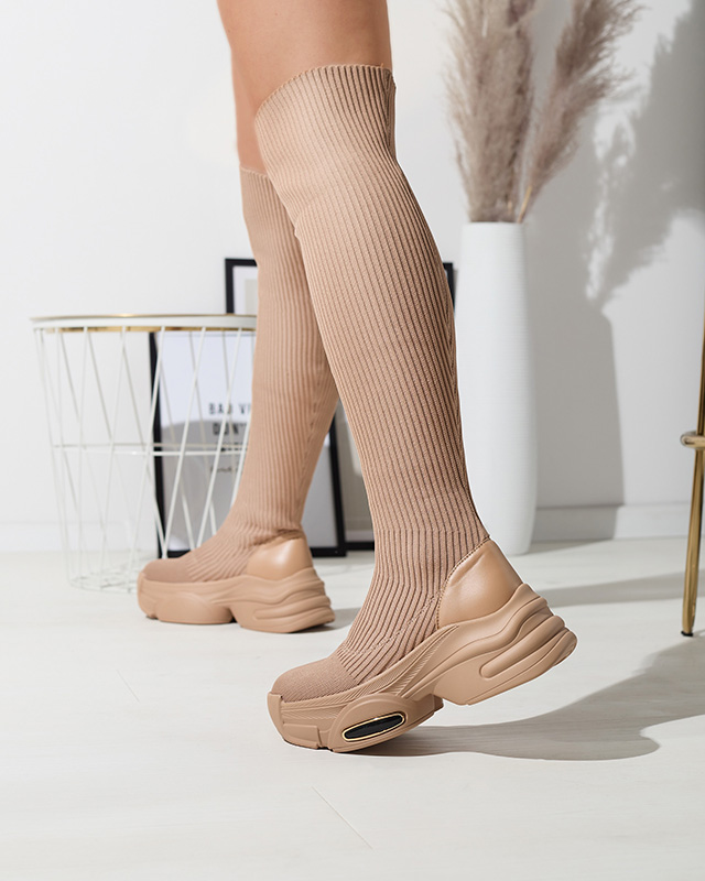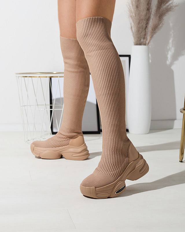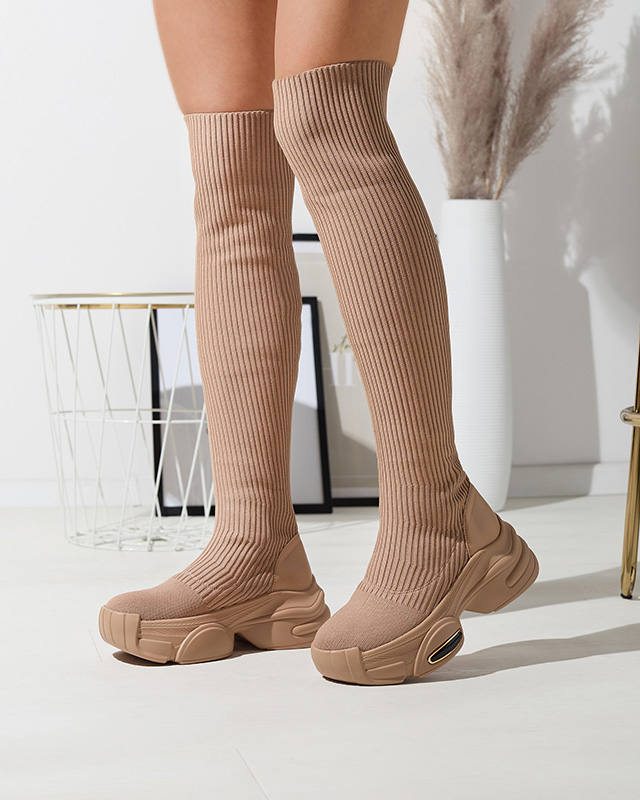 - Стильні жіночі чоботи вище коліна на суцільній підошві. Верх виконаний зі стрейчевої тканини тупу вельвет і має вставки з екошкіри. Устілка - м'яке хутро. Чудове доповнення до вашого вбрання! КОРИЧНЕВІ ЖІНОЧІ ЧОБОТИ GEORISA