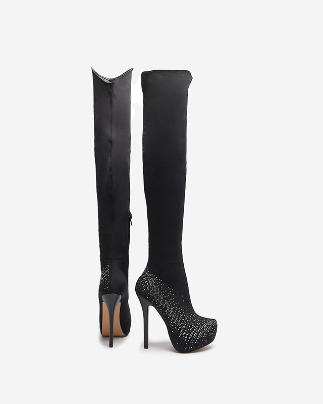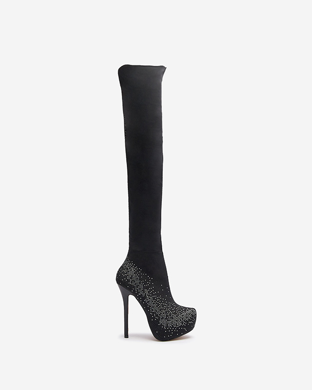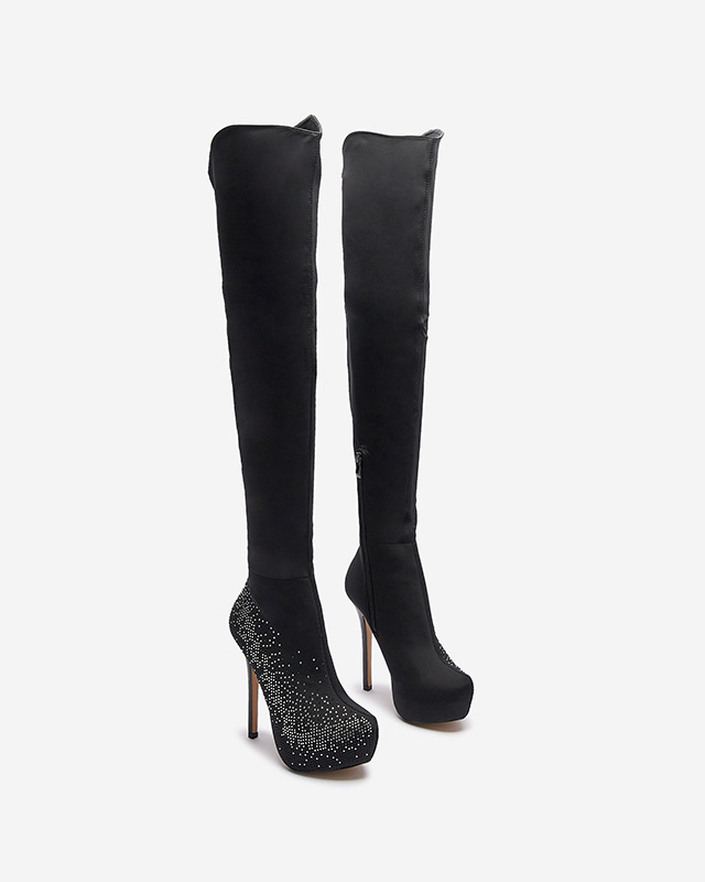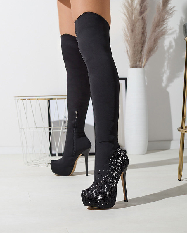 - Елегантні чоботи на шпильці і платформі з тканини. Устілка - хутро. Модель вище коліна, з круглим носом, застібається на блискавку до середини ікри. Верх декорований цирконами. ЧОРНІ ЖІНОЧІ ЧОБОТИ ЧОБОТИ AGIOCIO