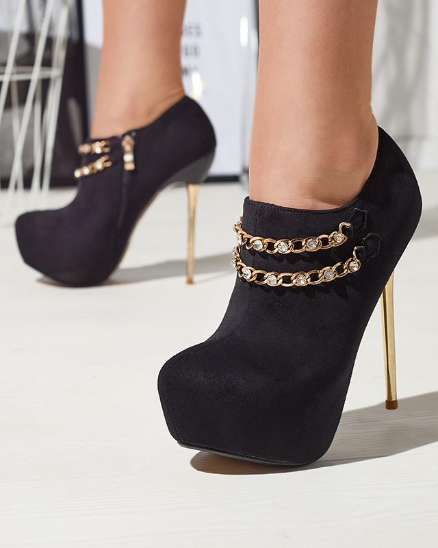 - Елегантні туфлі на високій шпильці та платформі зі шкіри екозамші. Устілка з екошкіри. Модель на блискавці з мигдалеподібним носком та декоративним ланцюжком з цирконами на верхній частині. Унікальна модель підійде до багатьох стильних образів!