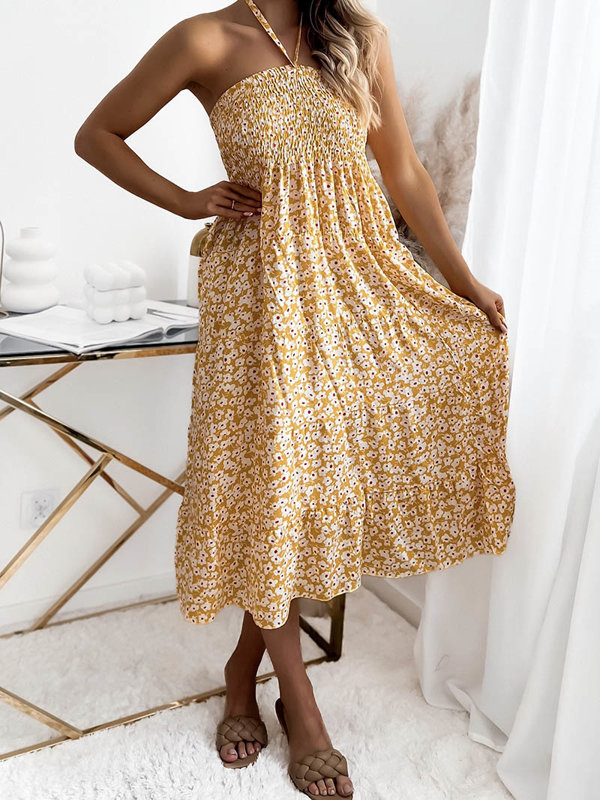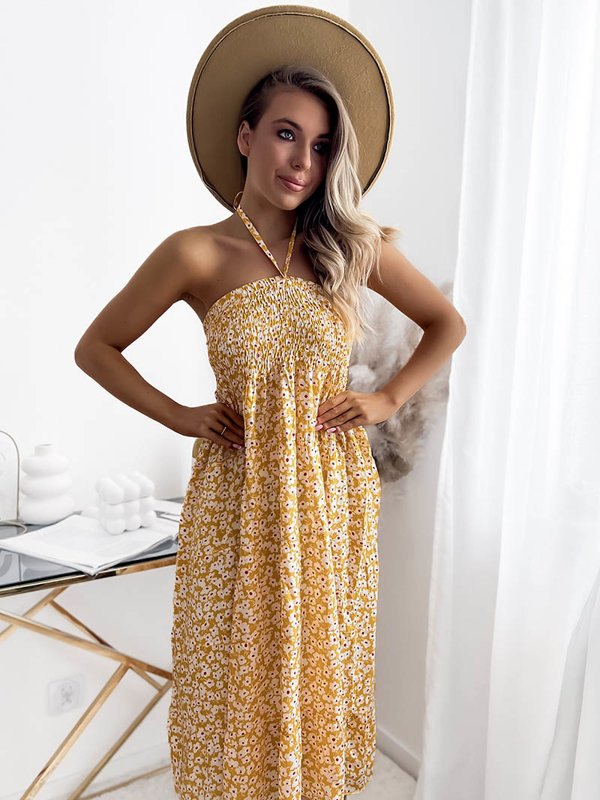 - Модна жіноча сукня, виконана з м'якої та повітряної квіткової тканини. Модель з прямокутним вирізом горловини, має широку резинку вгорі та зав'язки на горловині. Ідеальна основа для багатьох літніх образів! ПРИМІТКА: Похибка вимірювання (+/-) 1 см.