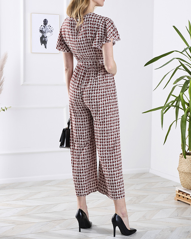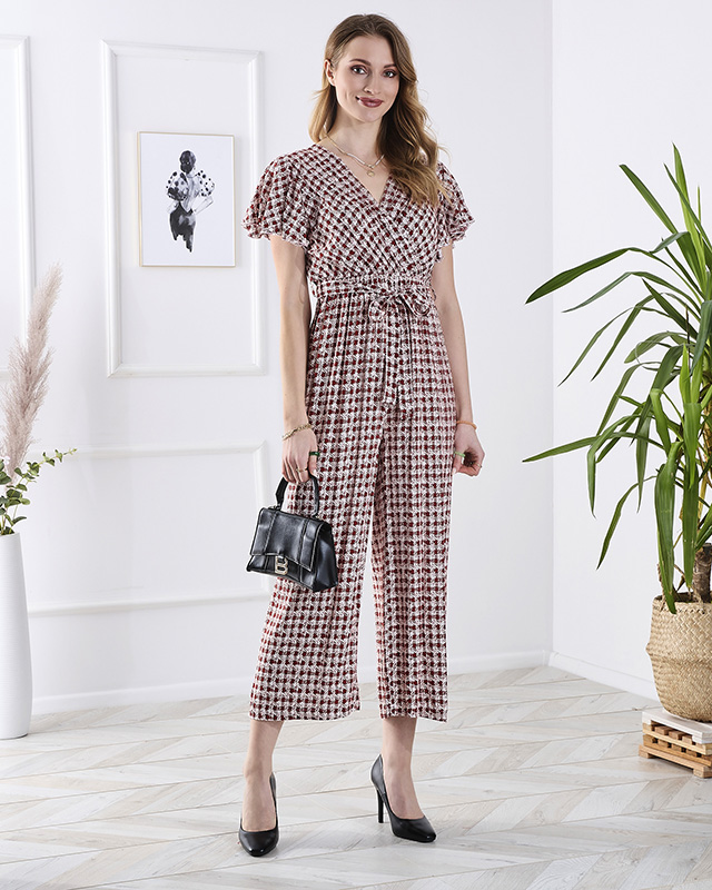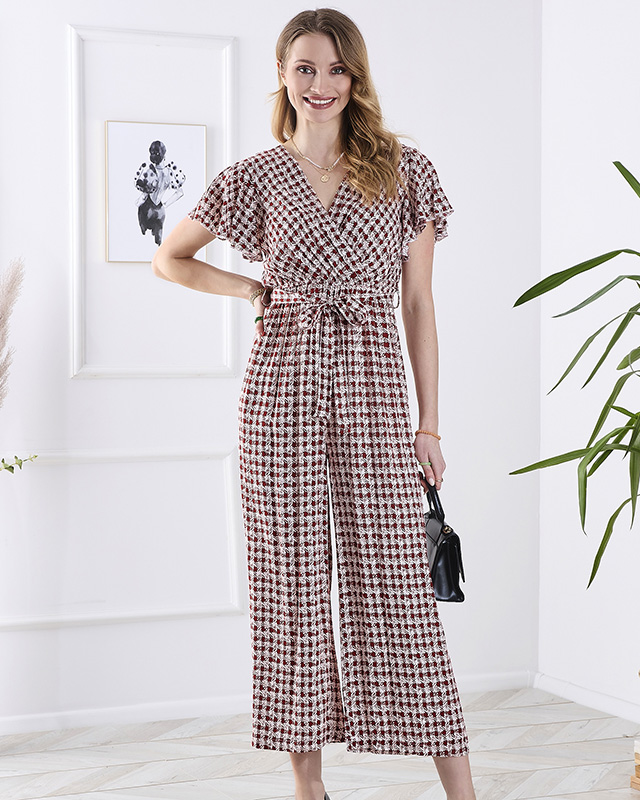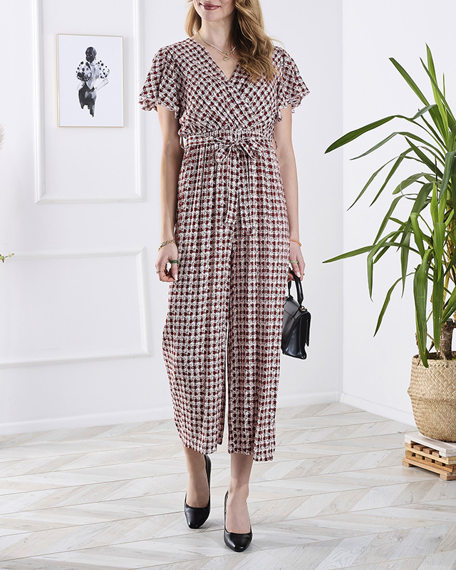 - Візерунчастий жіночий комбінезон з коротким рукавом і вирізом горловини конвертом. Модель має широкі, довгі штанини, резинку та зав'язку на талії. Ідеальний вибір для тих, хто цінує комфорт. ПРИМІТКА: Похибка вимірювання (+/-) 1 см.