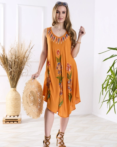 - Легка жіноча сукня типу нарзутка, виконана з м'якої та повітряної віскозної тканини. Модель має круглий виріз горловини та розкльошений, асиметричний поділ. Ідеальний варіант для відпустки! ПРИМІТКА: Похибка вимірювання (+/-) 1 см.