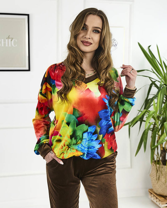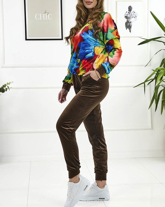 Коричневий жіночий велюровий світшот з кольоровим принтом - Одяг