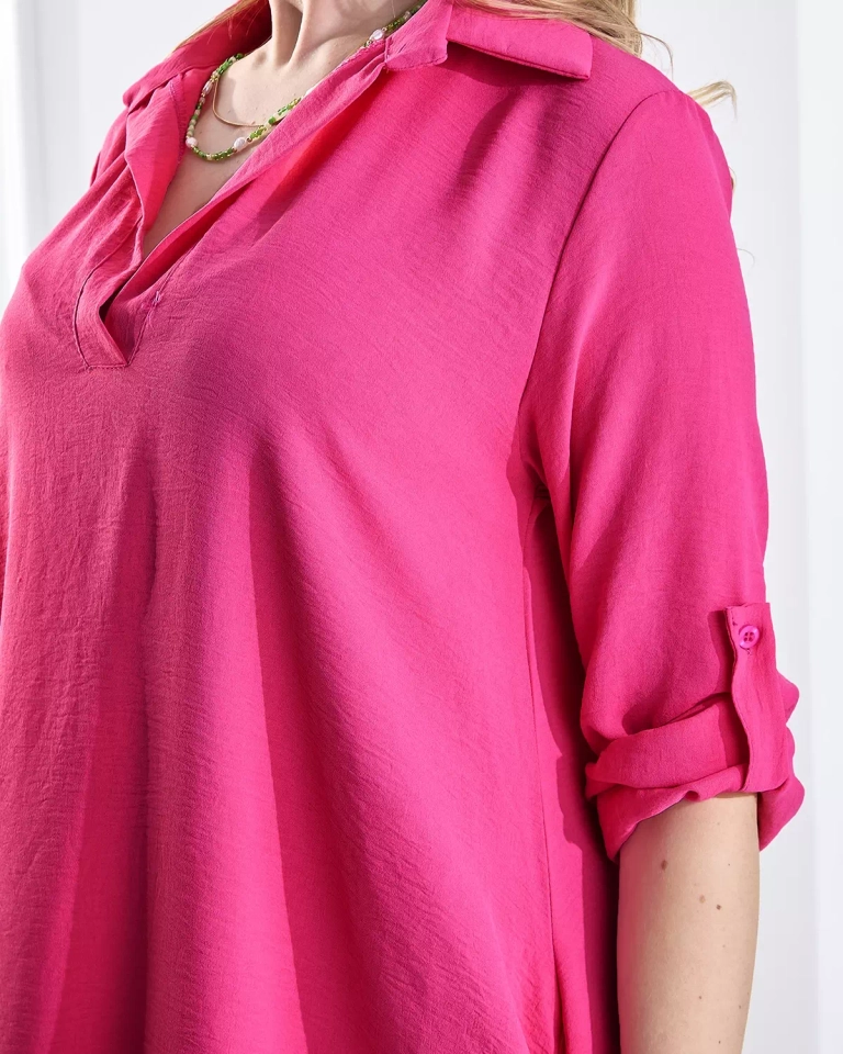 - Позачасова жіноча туніка оверсайз універсального розміру. Модель з серцеподібним вирізом горловини і коміром, має дві врізні кишені. Довгий рукав з можливістю закатати. Ідеальний варіант для літніх образів! ПРИМІТКА: Похибка вимірювання (+/-) 1 см.