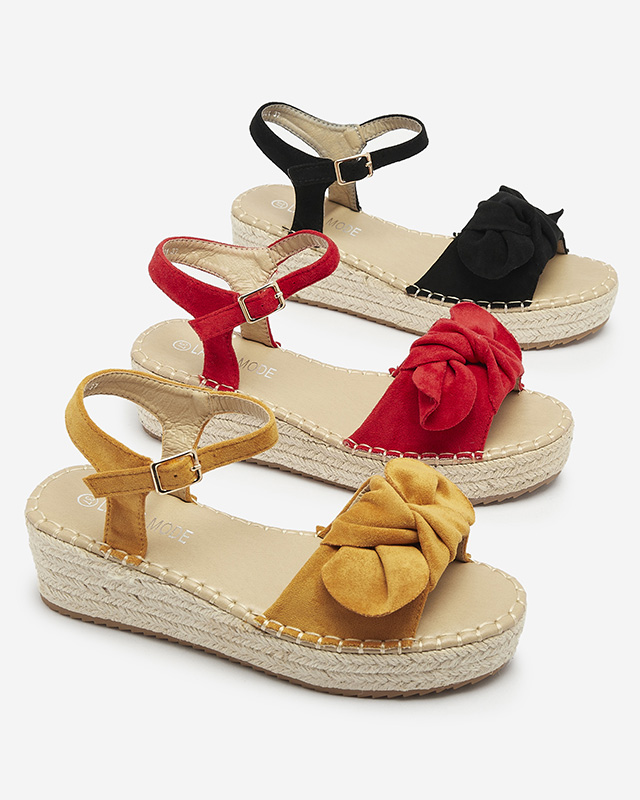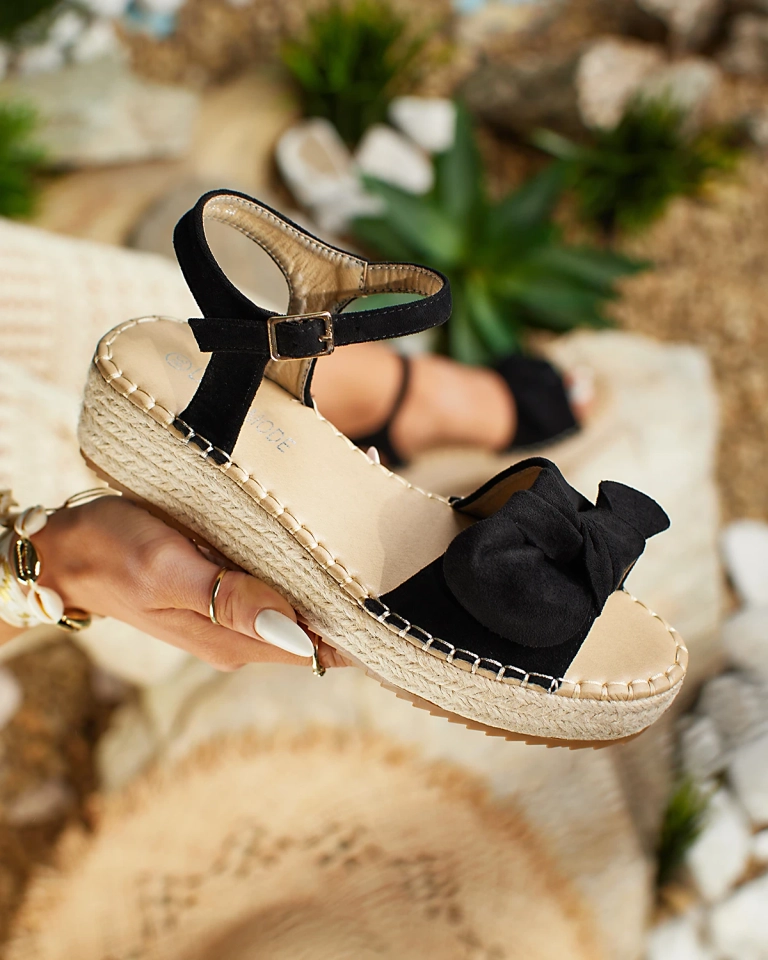 - Жіночі босоніжки а-ля еспадрильї на низьких підборах, ремінці виготовлені з натуральної замші, устілка - натуральна шкіра. Взуття декороване бантиком, має застібку-пряжку. УВАГА: модель рекомендована для людей з вузькою анатомією стопи.