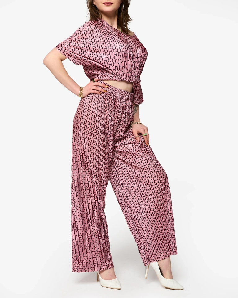 - Стильний жіночий комплект, виготовлений зі слизької візерункової плісированої тканини. Блуза з круглим вирізом горловини має короткий рукав. Брюки палаццо з широким поясом на талії та декоративними зав'язками. ПРИМІТКА: Похибка вимірювання (+/-) 1 см.