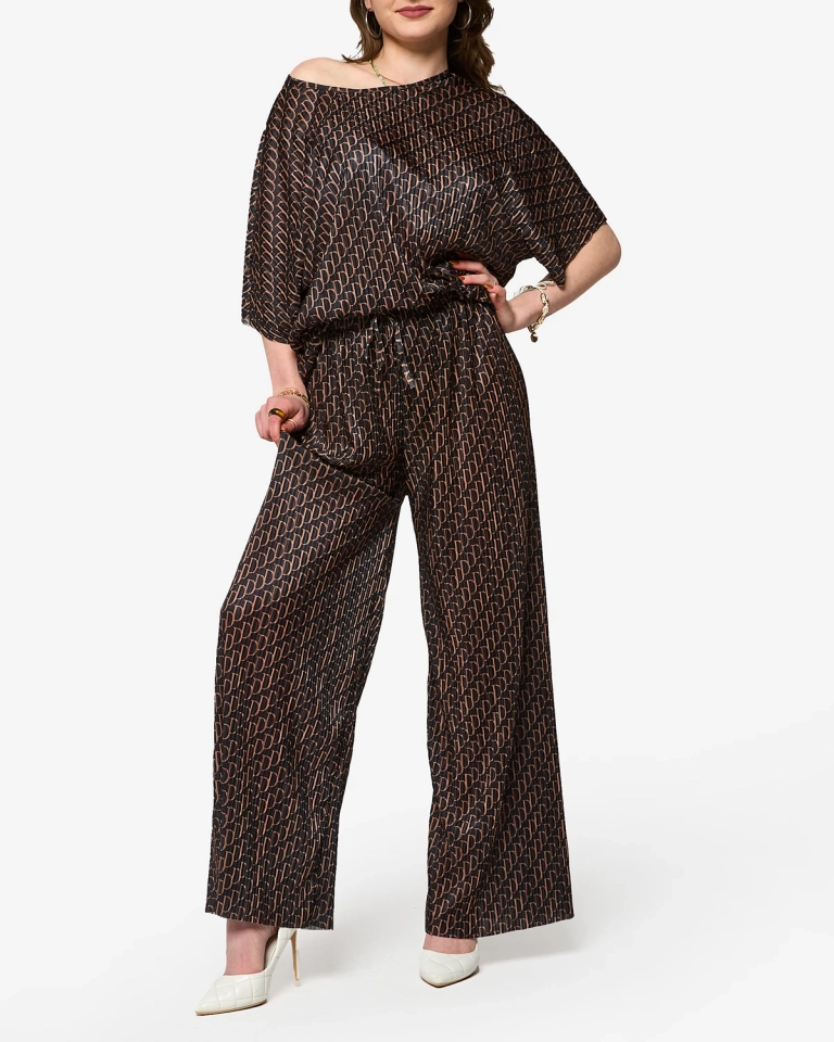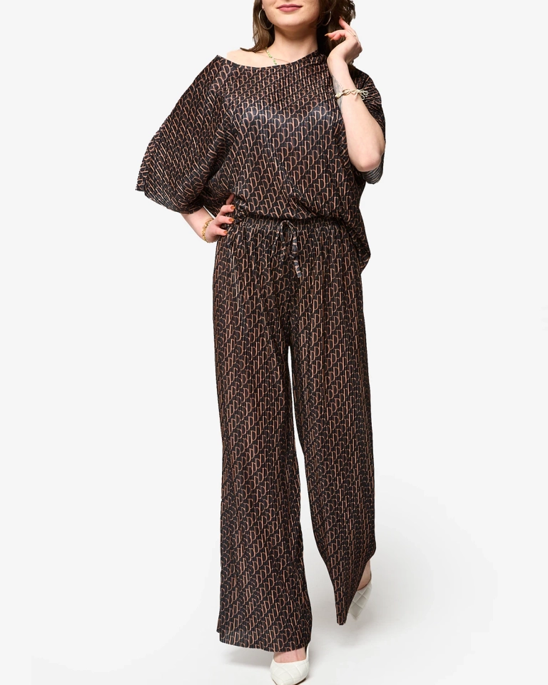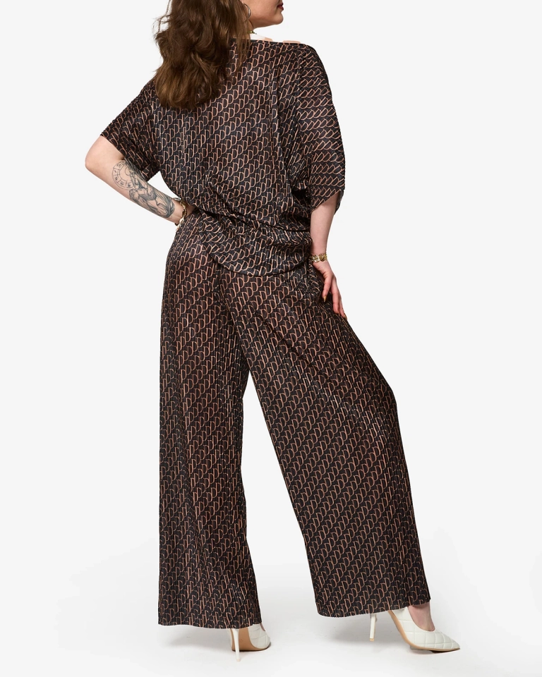 - Стильний жіночий комплект, виготовлений зі слизької візерункової плісированої тканини. Блуза з круглим вирізом горловини має короткий рукав. Брюки палаццо з широким поясом на талії та декоративними зав'язками. ПРИМІТКА: Похибка вимірювання (+/-) 1 см.