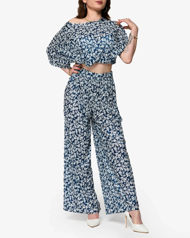Жіночий темно-синій плісирований комплект з чорними квітами - Одяг