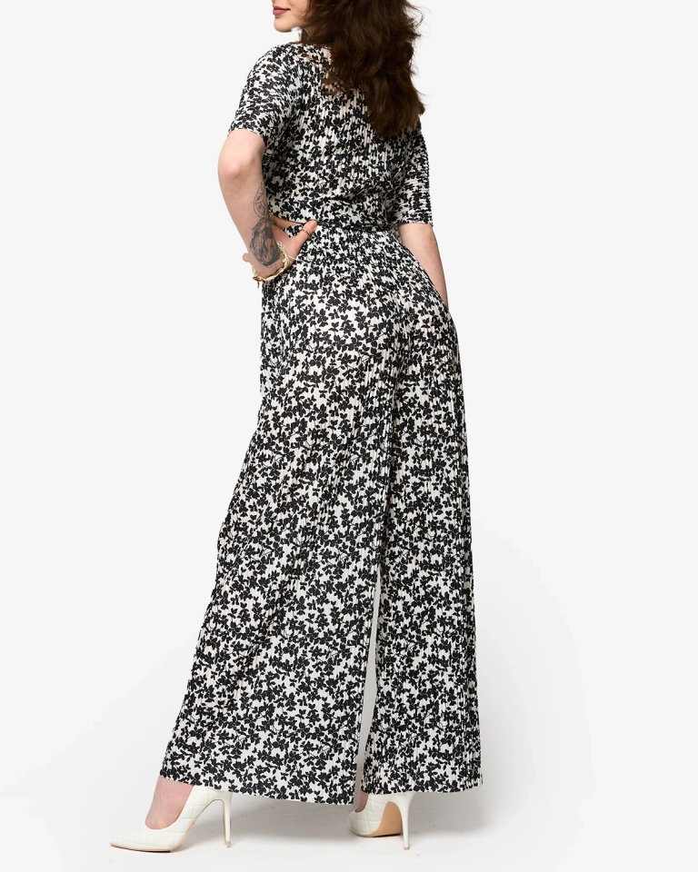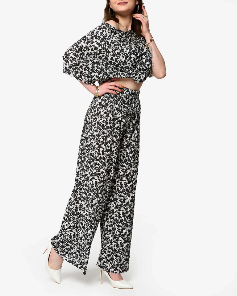 • Жіночий квітковий комплект, виготовлений зі слизької плісированої тканини. Блуза з круглим вирізом горловини має короткий рукав. Штани палаццо з широким поясом на талії та декоративними зав'язками. ПРИМІТКА: Похибка вимірювання (+/-) 1 см.