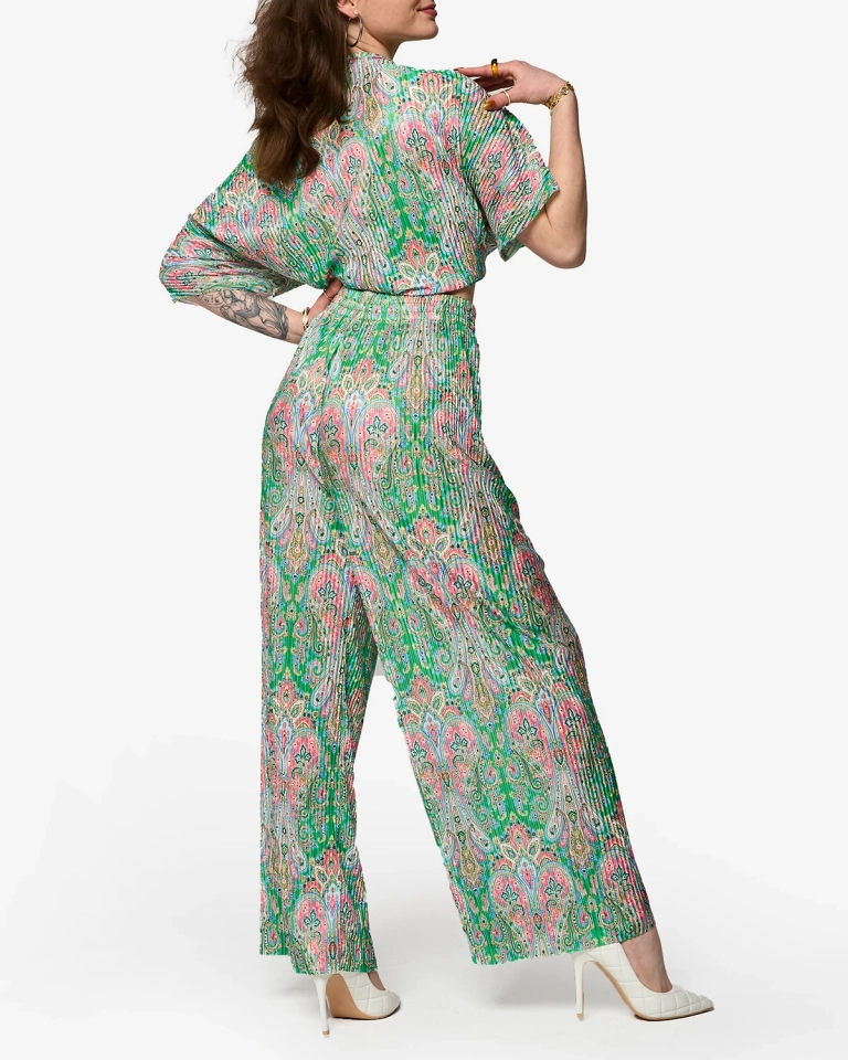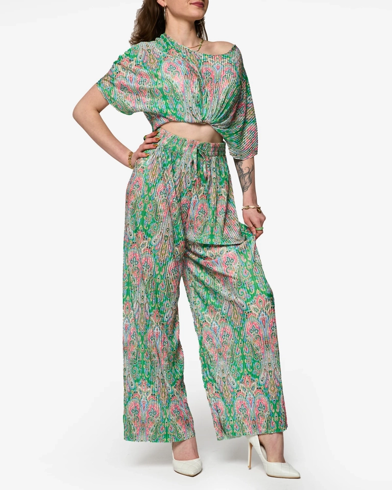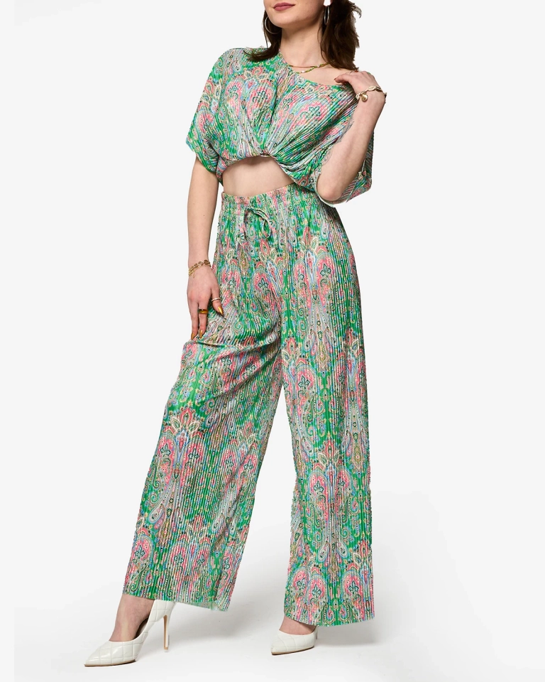 - Жіночий комплект з еластичної ребристої тканини. Блуза з коротким рукавом і круглим вирізом горловини. Довгі штани палаццо із завищеною талією, на резинці та зав'язках. Все прикрашено східним принтом! ПРИМІТКА: Похибка вимірювання (+/-) 1 см.