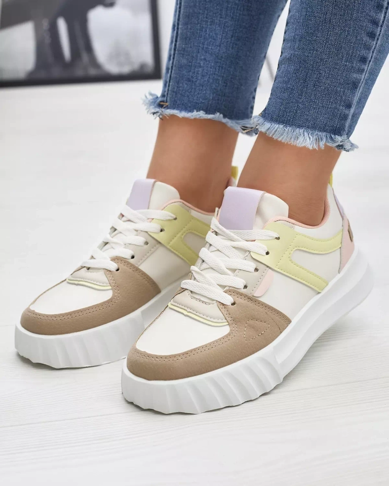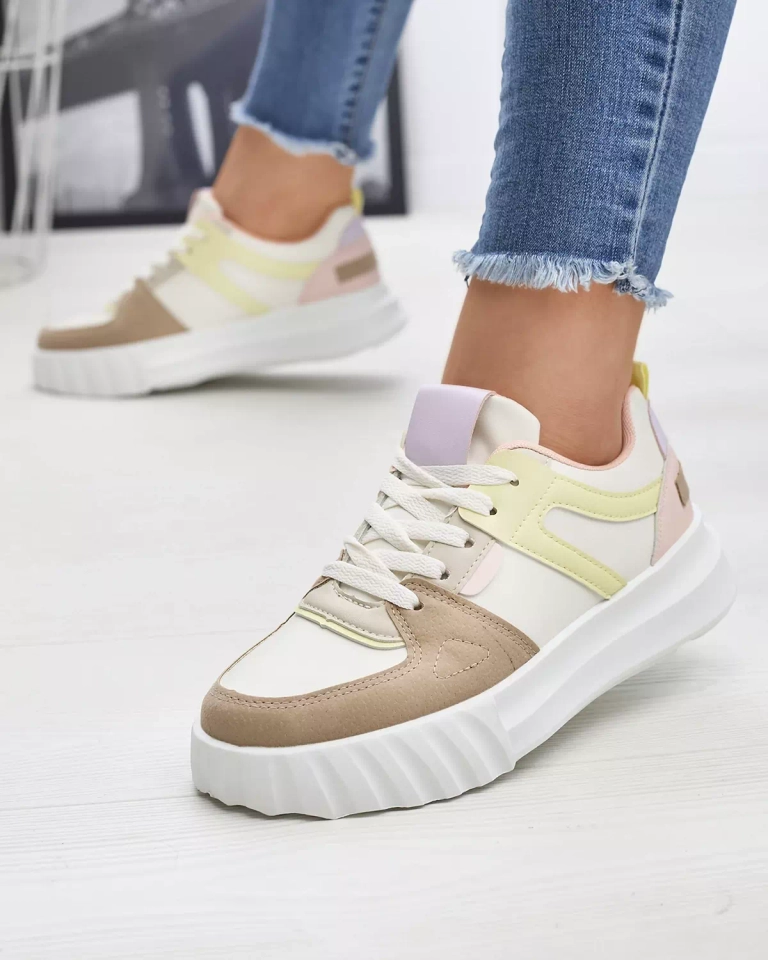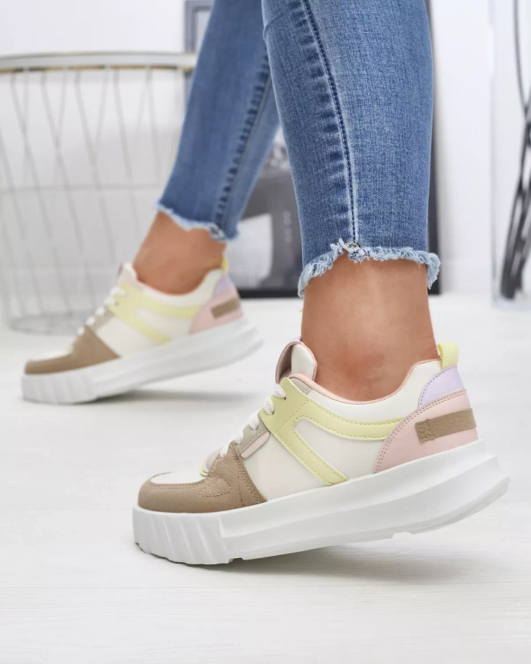 • Мега стильні, позачасові жіночі повсякденні спортивні туфлі. Верх взуття виконаний з екологічної шкіри, декорований різнокольоровими вставками. Середина підкладена тканинним матеріалом. Ідеальна основа для багатьох повсякденних образів!