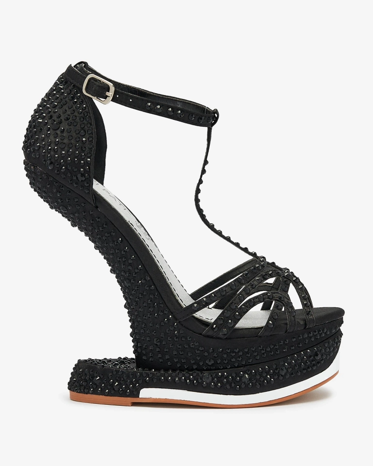 • Унікальні жіночі туфлі-човники з тканини та устілкою з натуральної шкіри. Ажурний верх декорований цирконами. Модель на платформі та невидимому високому каблуці. Застібаються на пряжку навколо щиколотки.