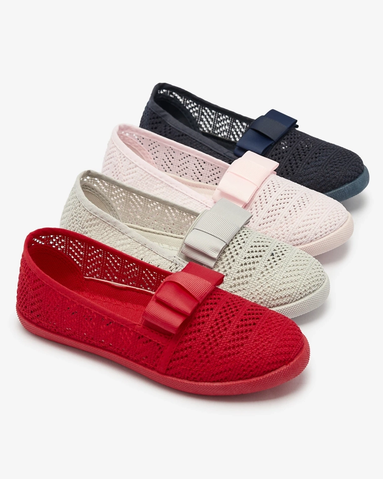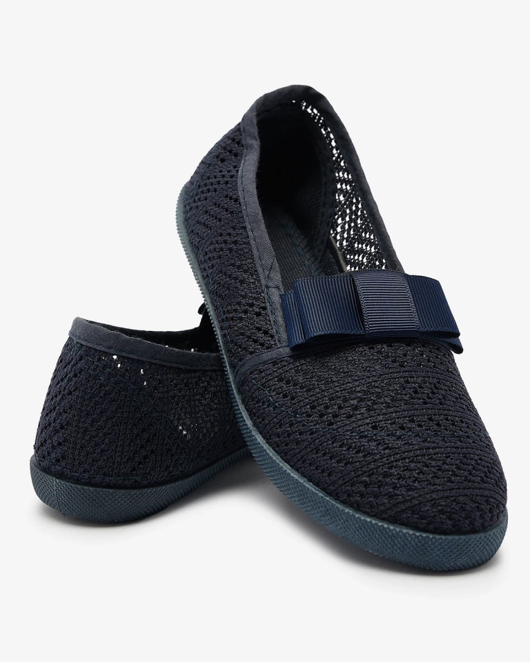 - Красиві жіночі сліпони. Верх виконаний з ажурного тканинного матеріалу, устілка також тканинна. Спереду пара прикрашена милим бантиком. Крім того, туфлі мають гумову вставку для легкого ковзання ніжки у взутті.