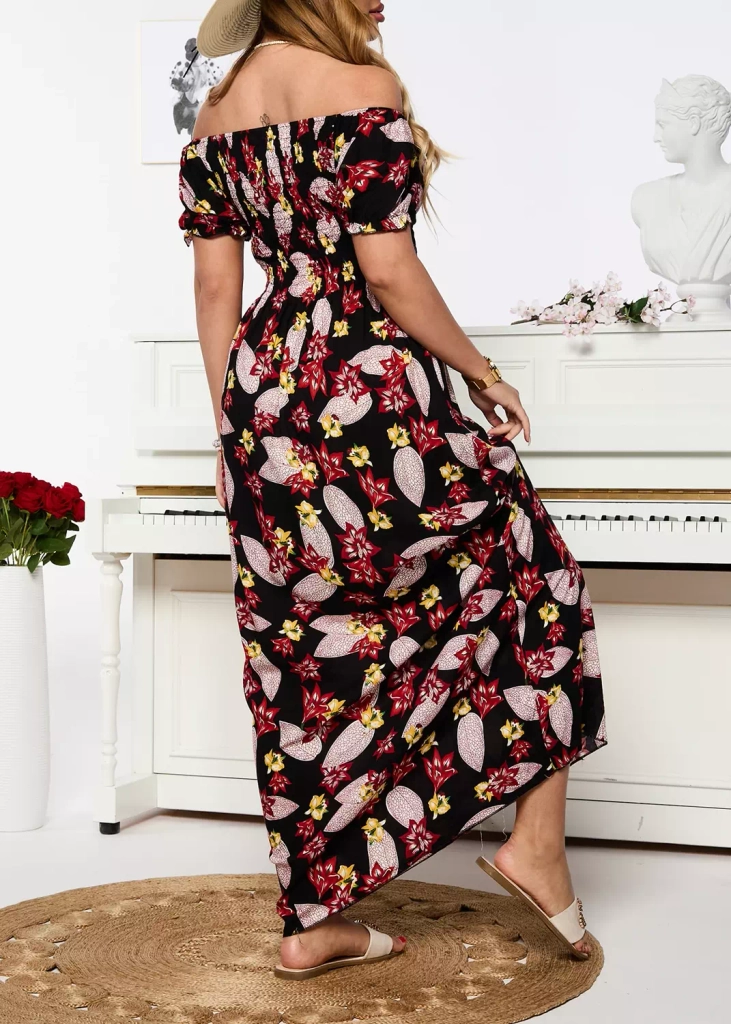 - Красива жіноча сукня з відкритими плечима а-ля хіспана. Модель виконана з легкої тканини з квітковим візерунком. На висоті грудей широка еластична резинка, що тягнеться. Виріб довжиною міді з коротким рукавом. ПРИМІТКА: Похибка вимірювання (+/-) 1 см