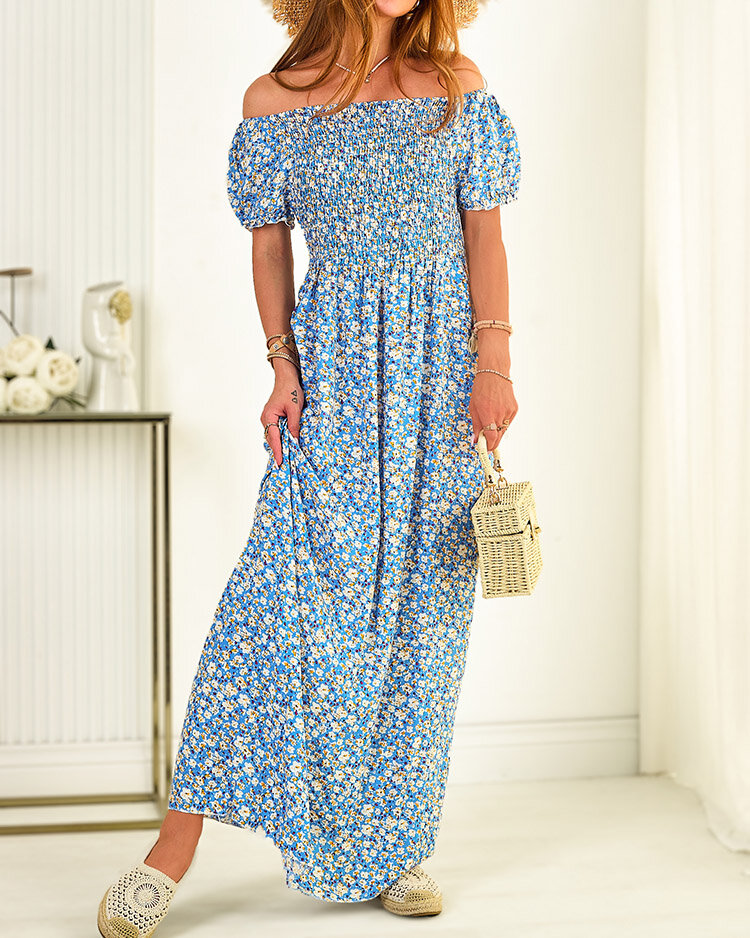 - Жіноча максі-сукня з квітковим візерунком, виконана з бавовняної тканини. Модель з круглим вирізом горловини а-ля гімнастерка, на резинці по ширині грудей і талії. Модель з коротким рукавом. Ідеальний варіант для літа! ПРИМІТКА: Похибка вимірювання (+/-)
