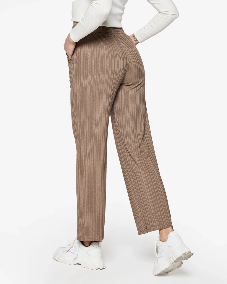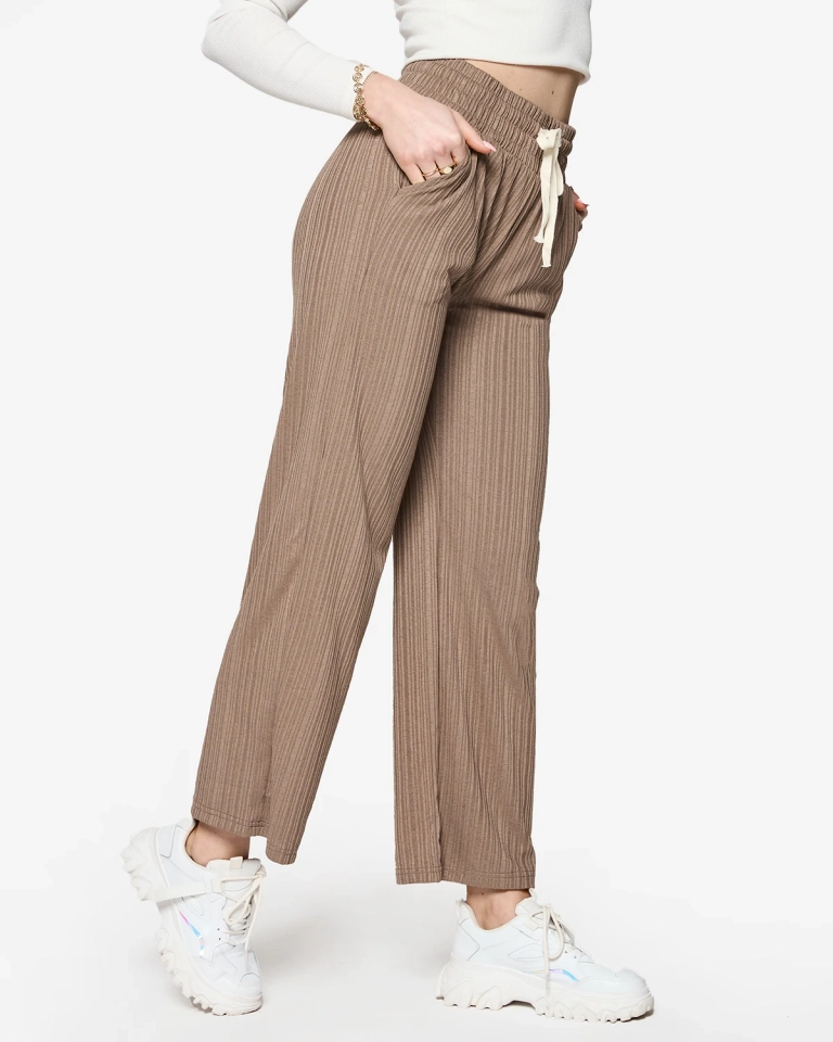 • Жіночі широкі брюки з легкої, ребристої тканини. Модель має еластичний пояс і, крім того, застібку та дві кишені. Комфортні та зручні! ПРИМІТКА: Похибка вимірювання (+/-) 1 см.