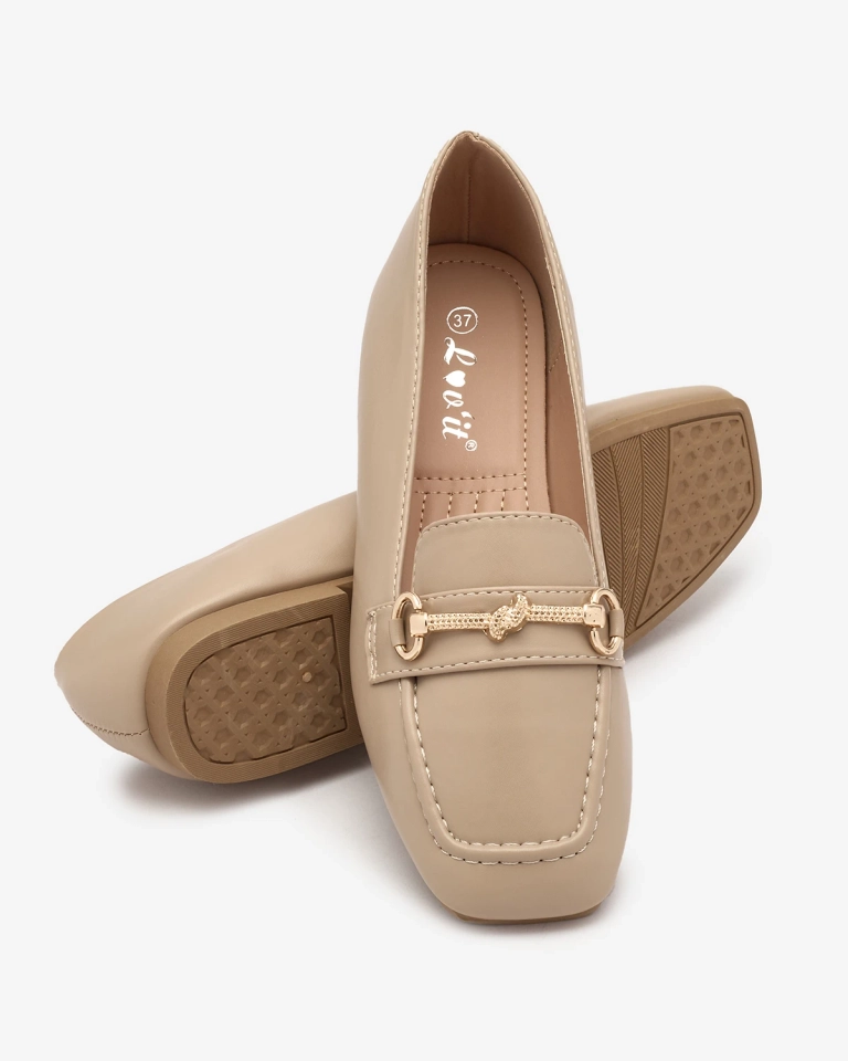- Класичні жіночі мокасини на плоскому каблуці. Верх та устілка виконані з екологічної шкіри. На квадратному носку металева прикраса золотистого кольору. Ідеальна основа для багатьох повсякденних образів!