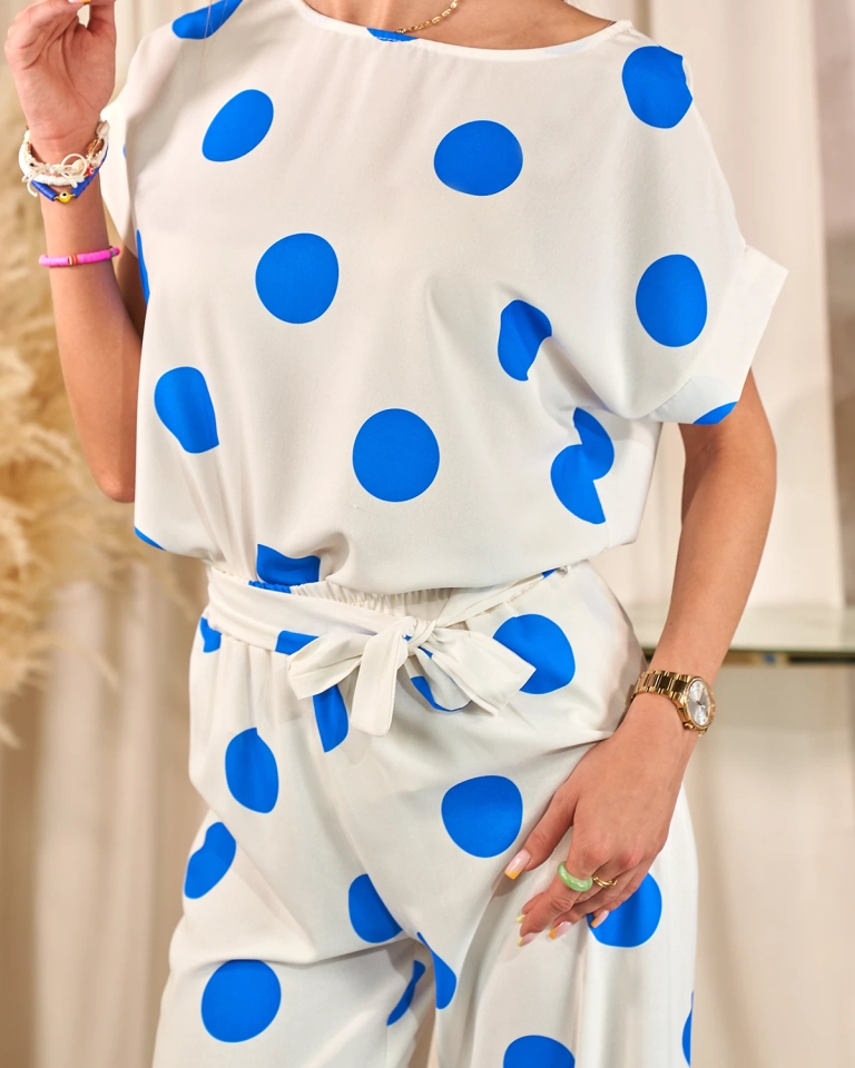 - Жіночий комплект з приємної, легкої тканини в горошок. Блуза має короткий рукав та круглий виріз горловини. Широкі штани з тканини оснащені еластичним поясом. Додатково в комплект входить тканинний ремінь. ПРИМІТКА: Похибка вимірювання (+/-) 1 см.