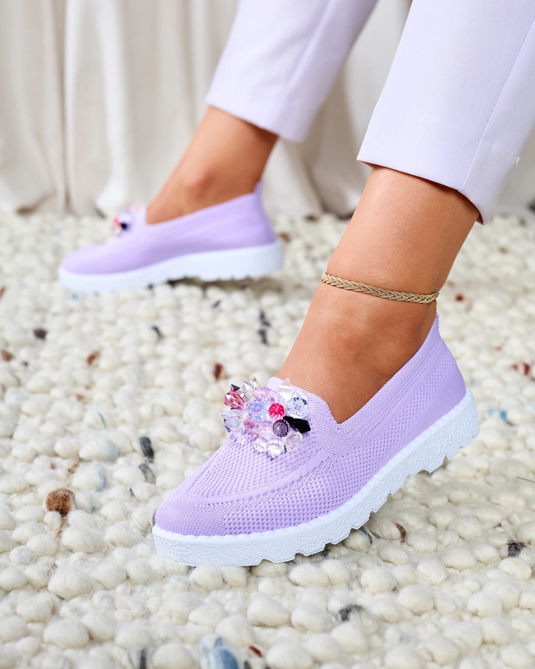 - Зі смаком виконані жіночі спортивні сліпони, прикрашені кристалами, з еластичного тканинного матеріалу. Середина також підшита тканиною.