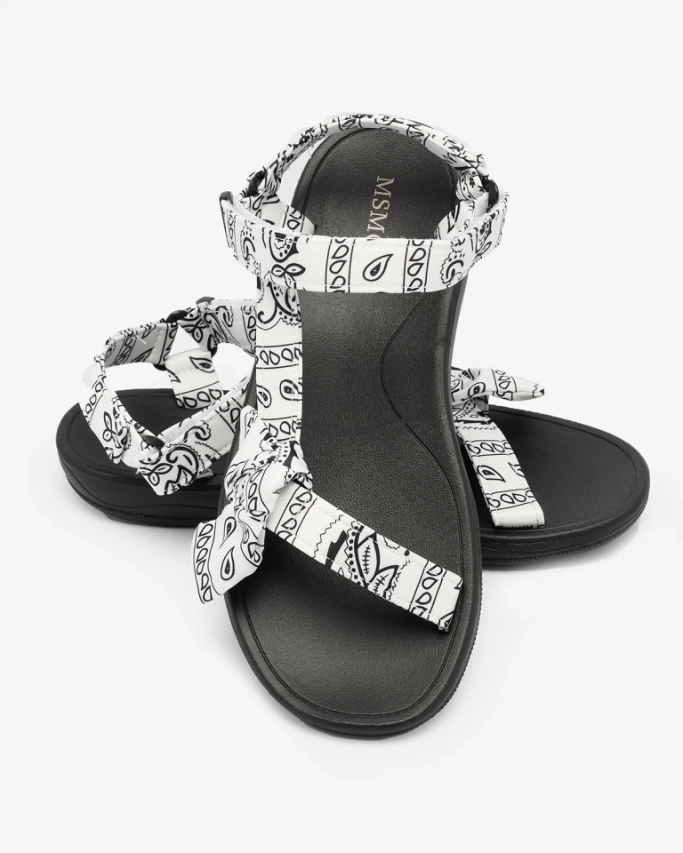 - Спортивні жіночі босоніжки на гумовій підошві. Ремінці виконані з тканинного матеріалу з принтом і декоровані бантиком. Представлене жіноче взуття застібається за допомогою ремінців на липучках. Вони добре тримаються на нозі!