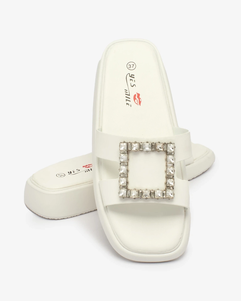 - Зі смаком підібрані жіночі шльопанці на плоскій підошві з великою прикрасою з кристалами - чудово підійдуть до широких штанів та короткого топу! Пара виготовлена з еко-шкіри, підошва - гумова. Примітка: на виробі відсутні деякі прикраси.