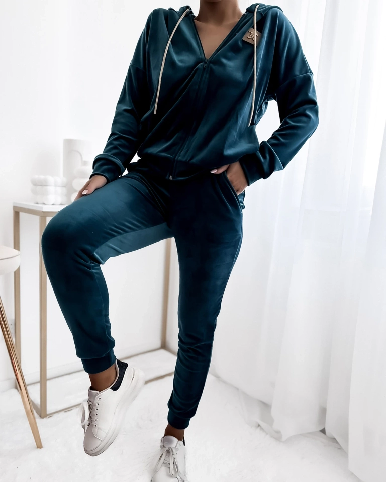 • Жіночий світшот з м'якого матеріалу а-ля велюр. Світшот декорований нашивкою, має капюшон, штани на зав'язках та 2 кишені. Штани з широким еластичним поясом і 2 врізними кишенями. ПРИМІТКА: Похибка вимірювання (+/-) 1 см.