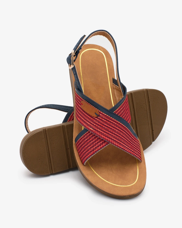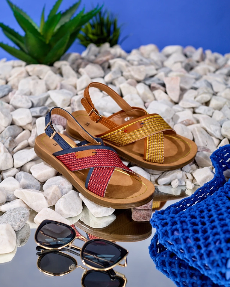 - Непідвладні часу жіночі босоніжки на плоскій підошві. Ремінці з комбінації екологічної шкіри та тканинного матеріалу, устілка з екологічної матової шкіри. На щиколотці ремінець застібається на пряжку.